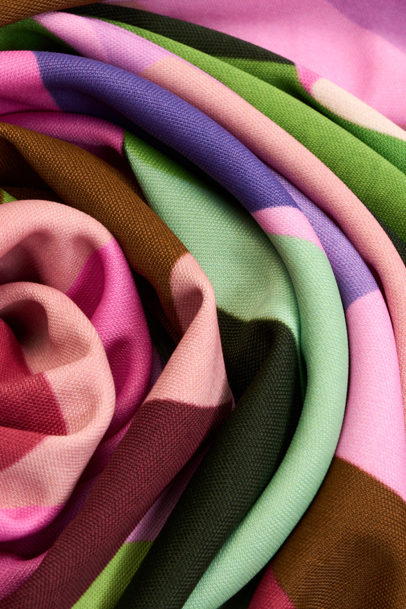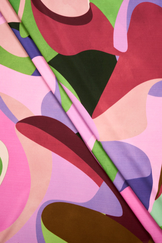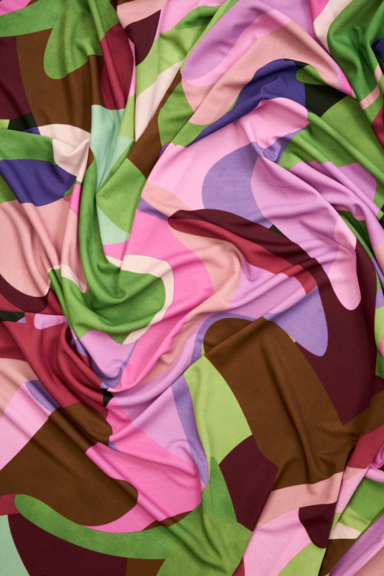 Italiensk viskose strikket stof med et farverigt, geometrisk mønster. Stoffet er kødfuldt, elastisk, køligt i berøring, helt uigennemsigtigt, mat og glat. Et fantastisk bud på sommertøj som kjoler, bluser, nederdele, shorts eller bukser.