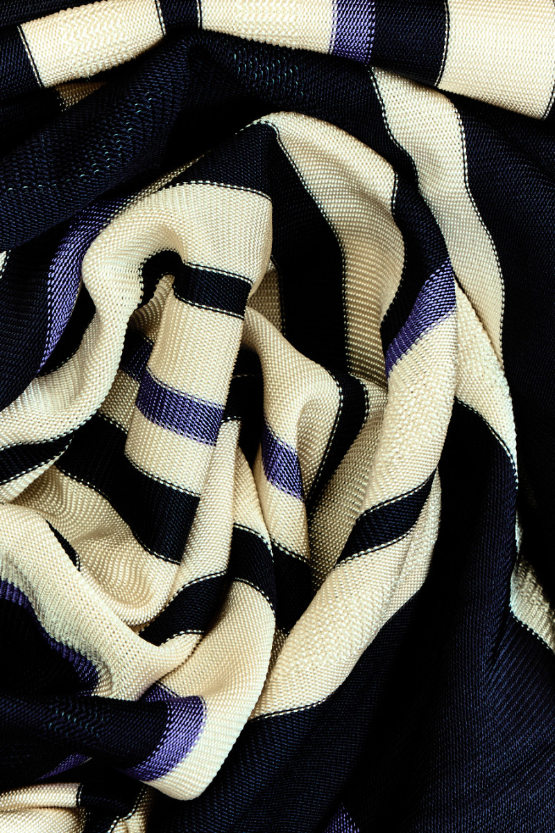 Italiensk 100% viskose strikket stof med striber i marineblå, lilla og creme. Det tætte mønster gentages hver 24. cm. Det strikkede stof er flydende, let, elastisk, tyndt, men uigennemsigtigt. Den er perfekt til syning af bluse, kjole og nederdel.