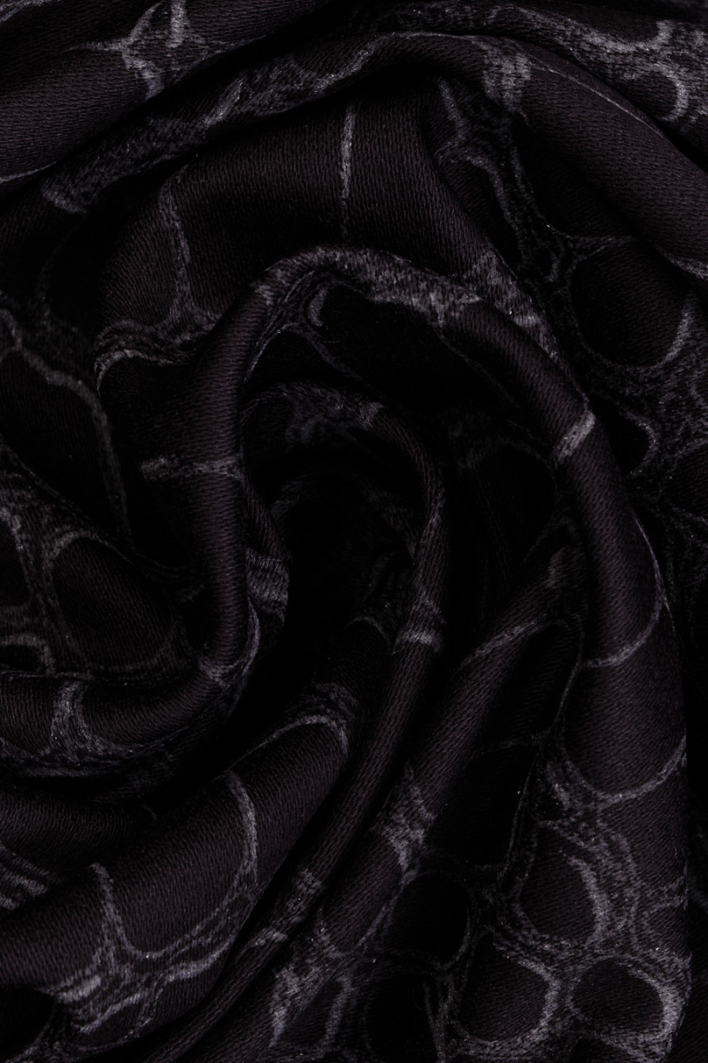 Italiensk bomuldsjerseystof med krokodilleskindsmotiv på en mørk lilla baggrund. Det tætte mønster er lavet i grå farve. Det strikkede stof er uigennemsigtigt med en kompakt vævning, elastisk, kødfuld og blidt stiv. Et ideelt forslag til fans af dyremønstre, hvorfra du kan sy bukser, jakker, sweatshirts.