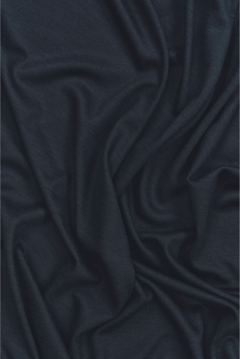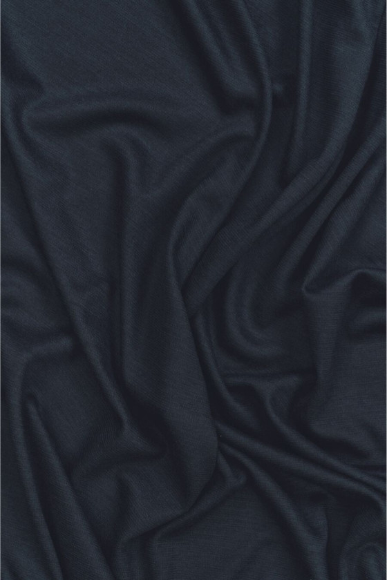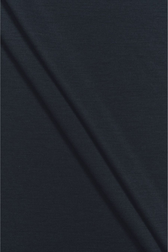 Italiensk polyester jersey, marineblå sweater med tilsætning af uld og elastan. Strikket stof med en lidt løsere vævning, medium tykkelse, mat og elastik. Den er perfekt til syning af hverdagstøj, såsom kjoler, tunikaer, lette trøjer eller cardigans.