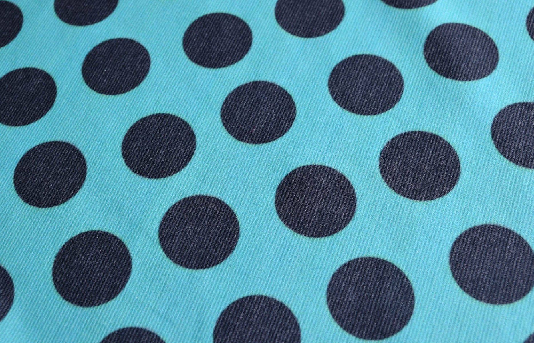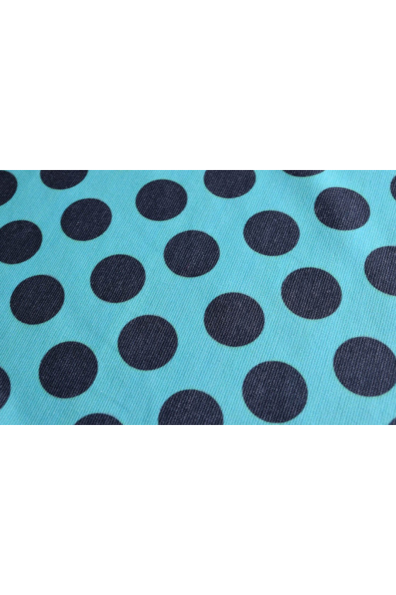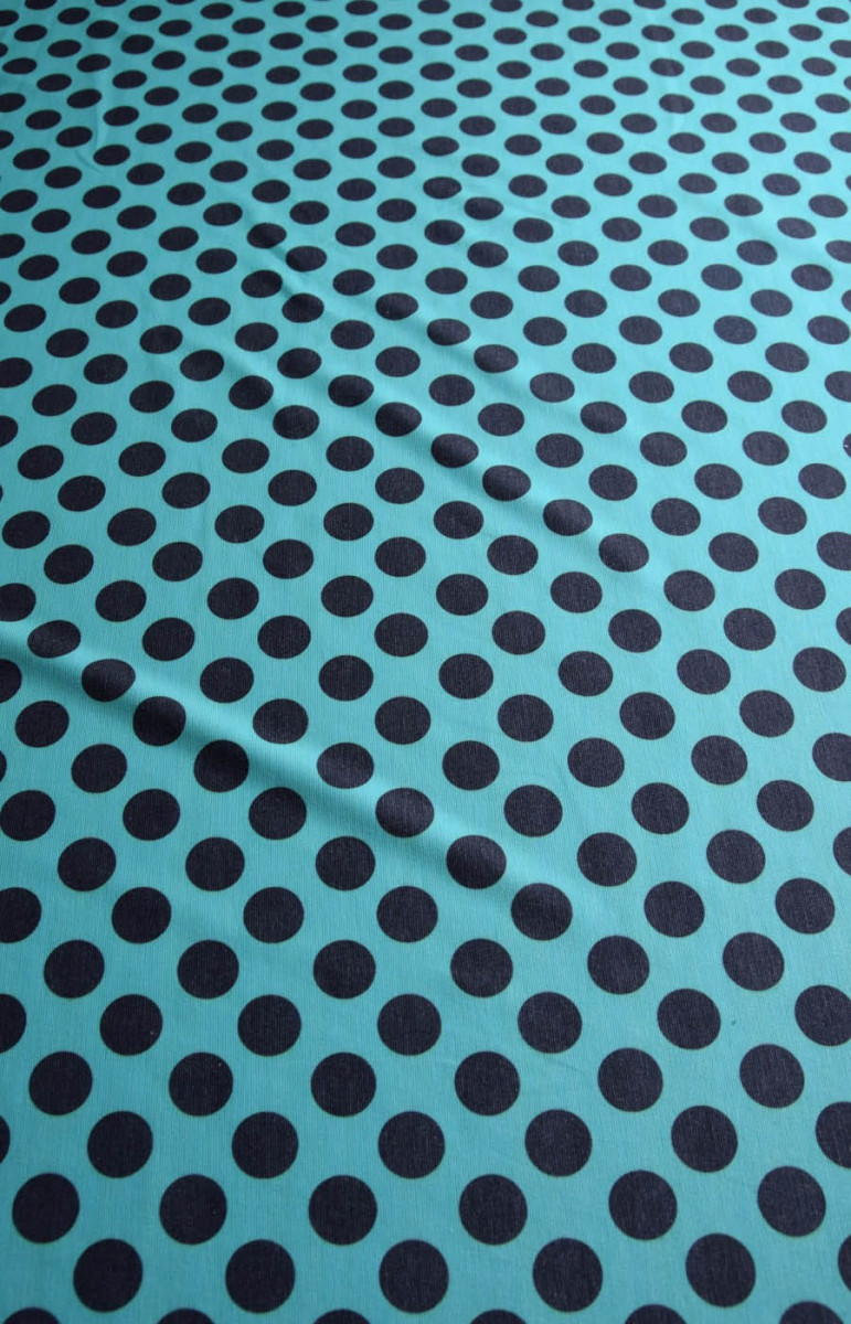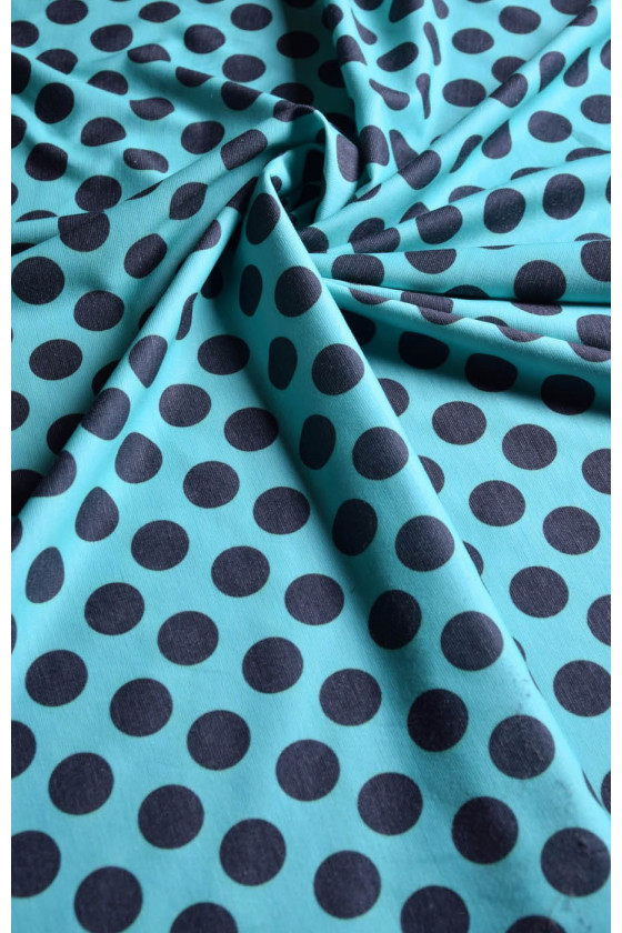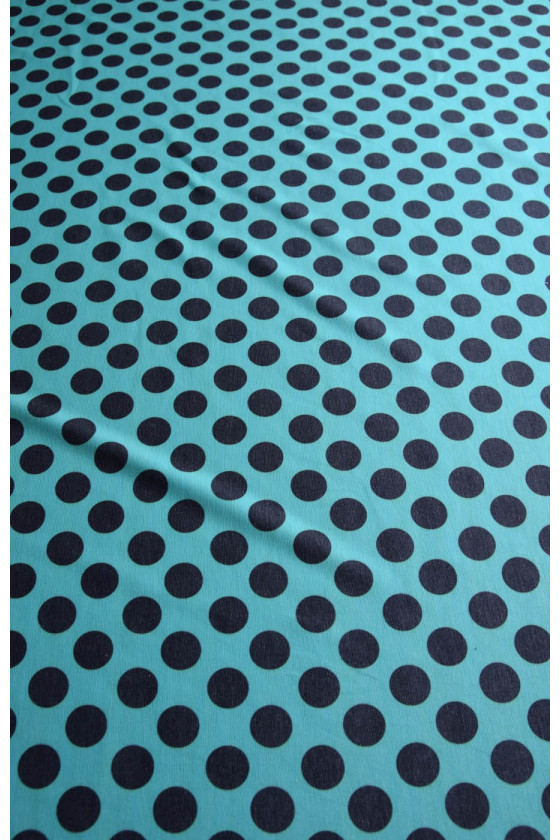 Elastisk strikket stof af mellemtykkelse beregnet til kjoler, nederdele, strikkede jakker. Polka prikker er ca. 2,5 cm i størrelse.