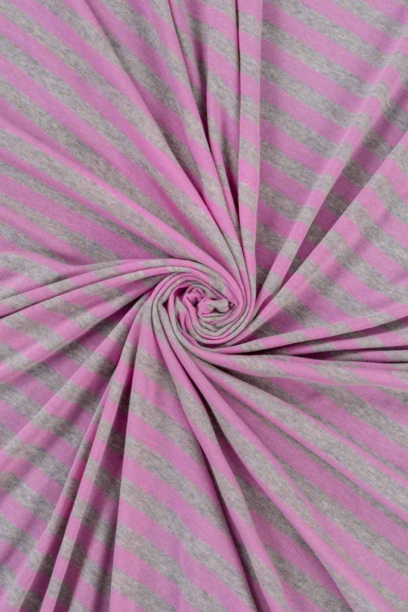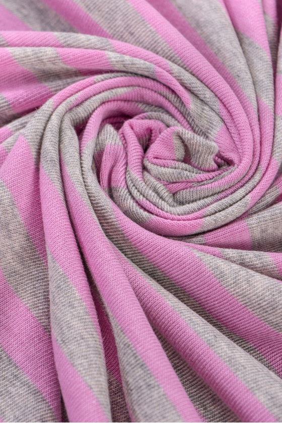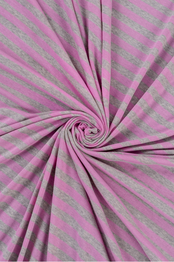 Italiensk viskose strik med grå og lyserøde striber - meget god kvalitet. Perfekt til at sy en bluse eller t-shirt.