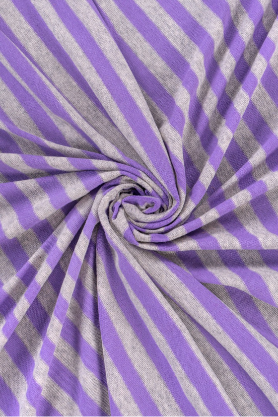 Italiensk viskose strikket stof med grålilla striber - meget god kvalitet. Perfekt til at sy en bluse eller t-shirt.