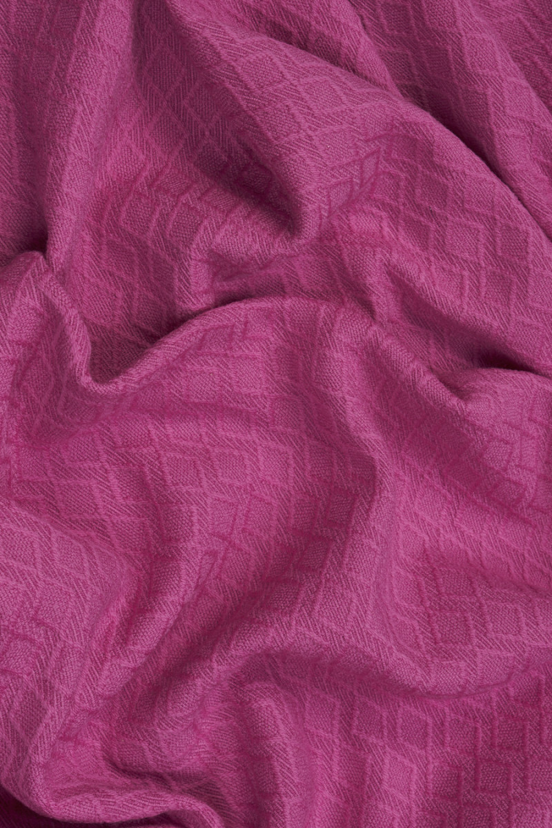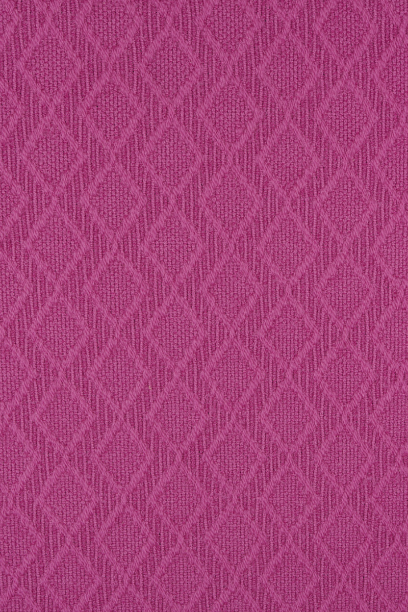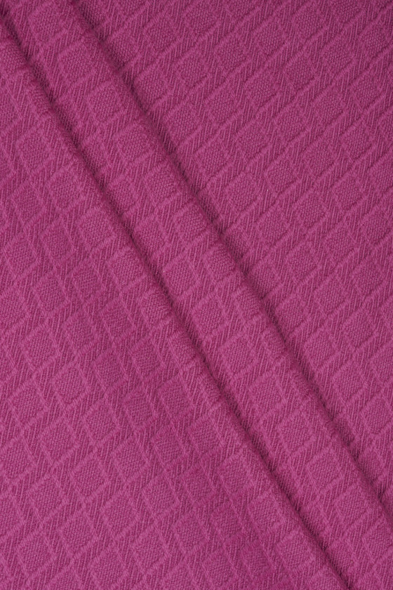 Italiensk sweaterstof i pink med motiv af små diamanter (3 cm), vævet af verginuld med en blanding af polyamid. Tykkere, ikke-elastisk stof med en tæt vævning. Perfekt til syning af en sweater eller et sjal.