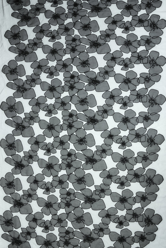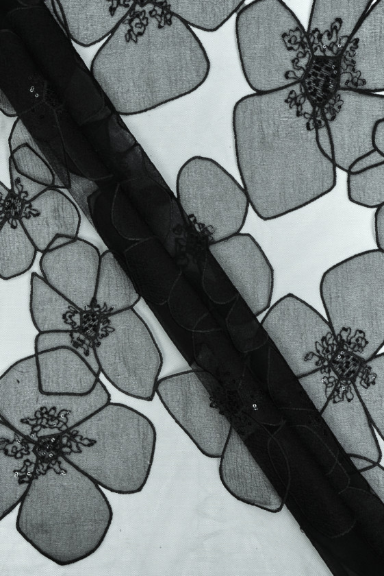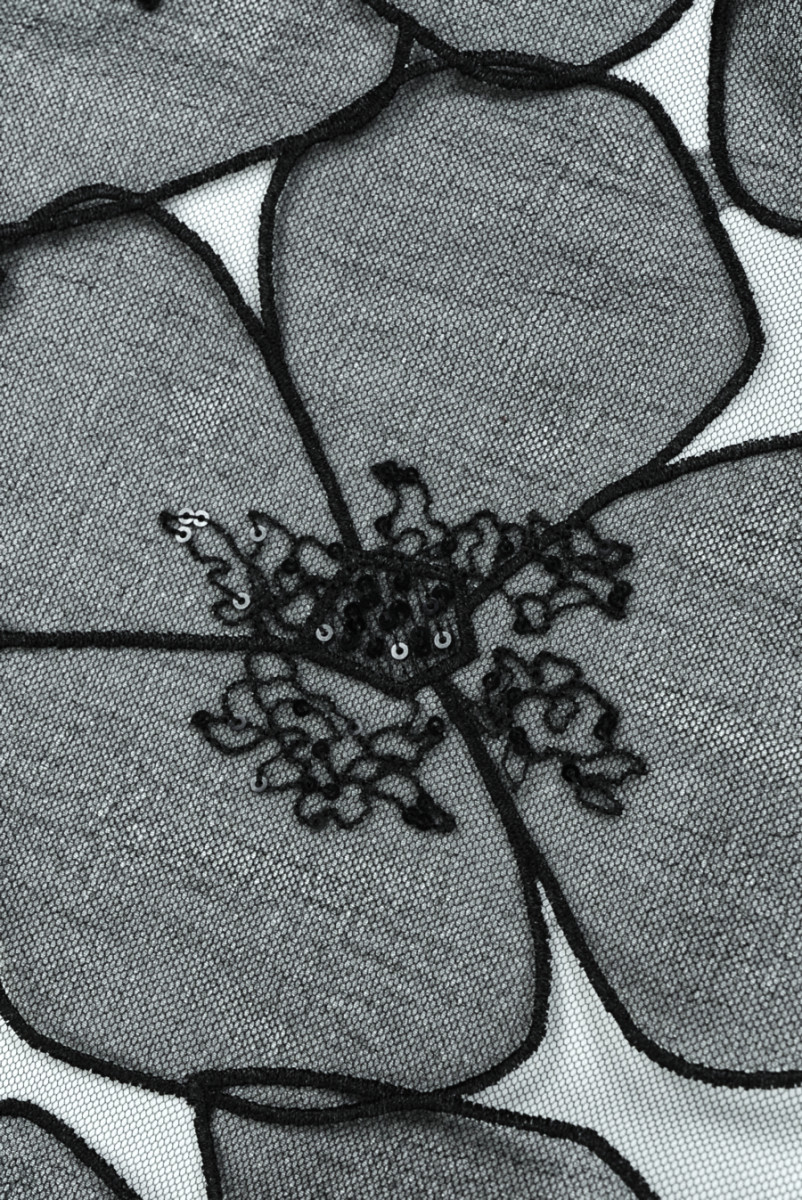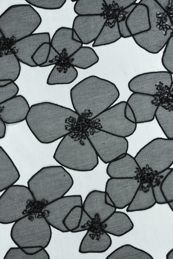 Italiensk tyl med klassiske sorte øjer med et motiv af store, sorte blomster lavet af let bølget organza. De større blomster er 20 cm * 23 cm, de mindre 10 cm * 14 cm. Mønsteret er tæt lagt på en bredde på 135 cm, hele tyllen er 160 cm bred. Blomsterne overlapper hinanden, og deres centre er dekoreret med små, sorte pailletter. Materialet er gennemsigtigt, fleksibelt, let stift og selve blomsterne har en meget delikat glans. Et originalt stof, hvorfra du kan skabe kjoler, nederdele, bluser.