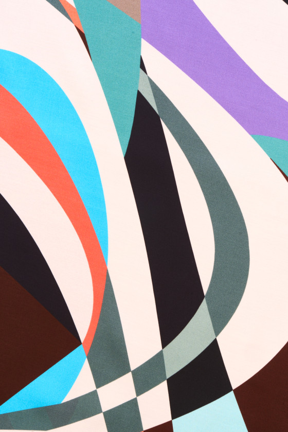 Italiensk stof 100% viskose med farverige geometriske motiver. Et originalt mønster i energiske farver, der består af elementer i forskellige størrelser og former. Stoffet er satin, blødt, flydende, let og meget behageligt at røre ved. Et interessant forslag til unikke outfits som kjoler, nederdele, bluser og skjorter.