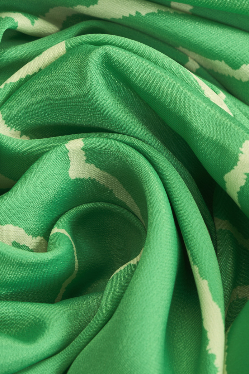 Italiensk stof vævet af viskose og silke med geometriske motiver i ecru på grøn baggrund. Et tæt mønster, der skildrer forskellige former, arrangeret tæt på hinanden. Stoffet er tyndt, men uigennemsigtigt, let, ikke-elastisk og flydende. Et godt stof, hvorfra kjoler, bluser, skjorter og nederdele kan laves.