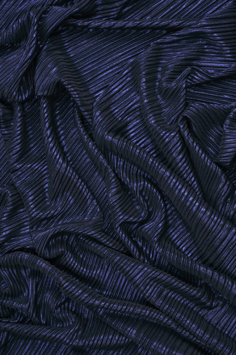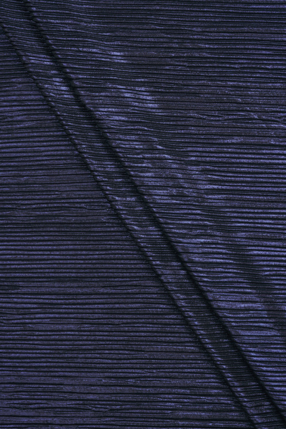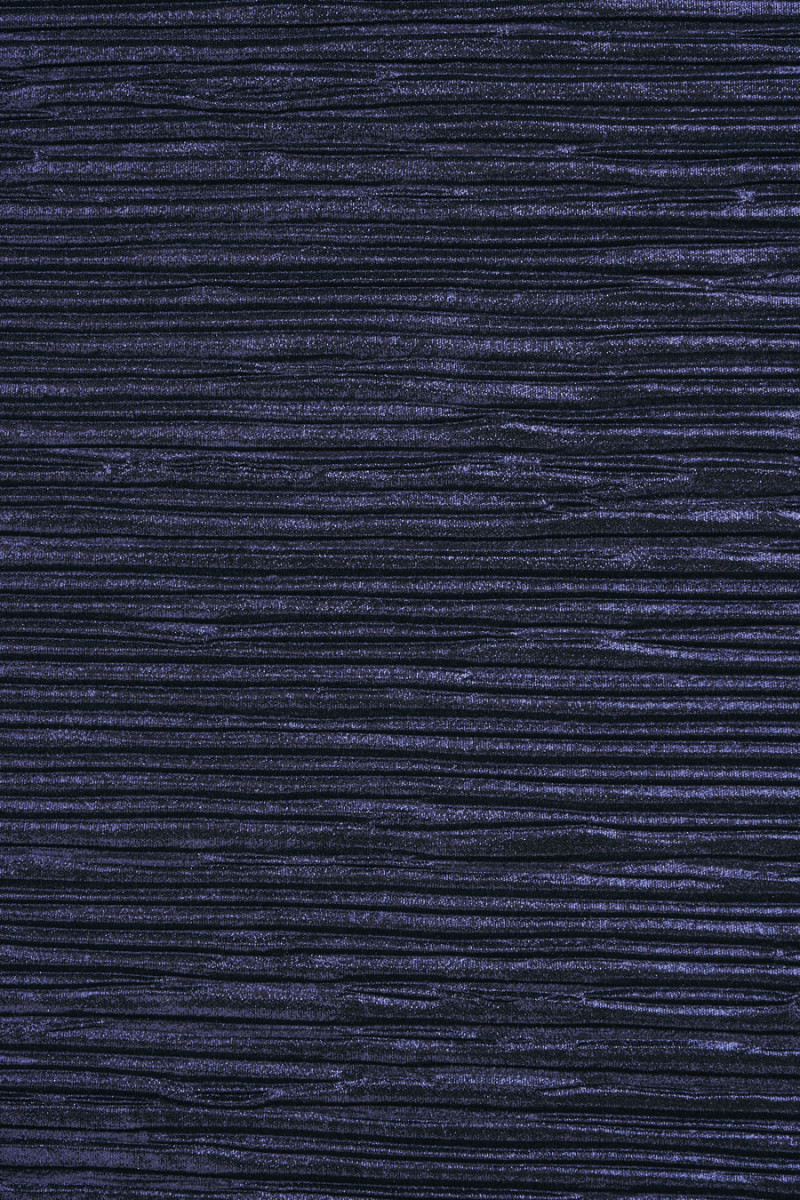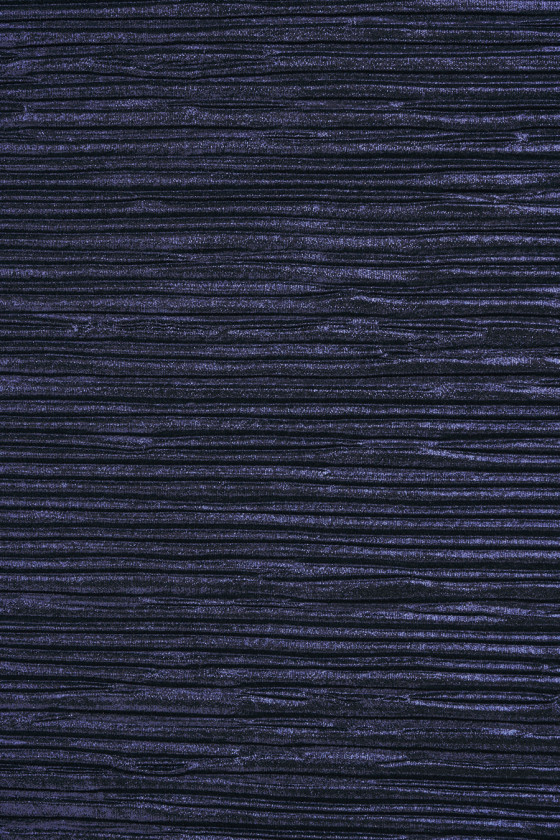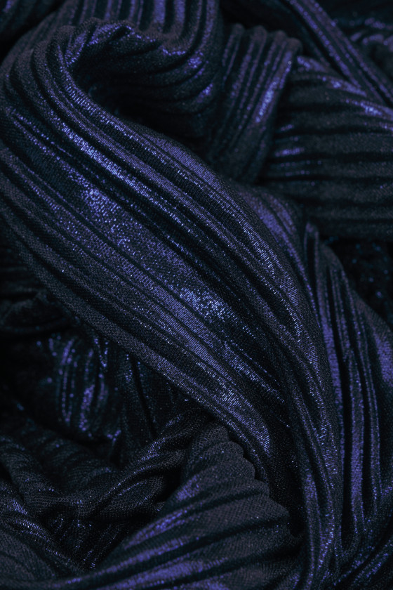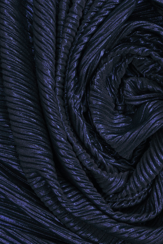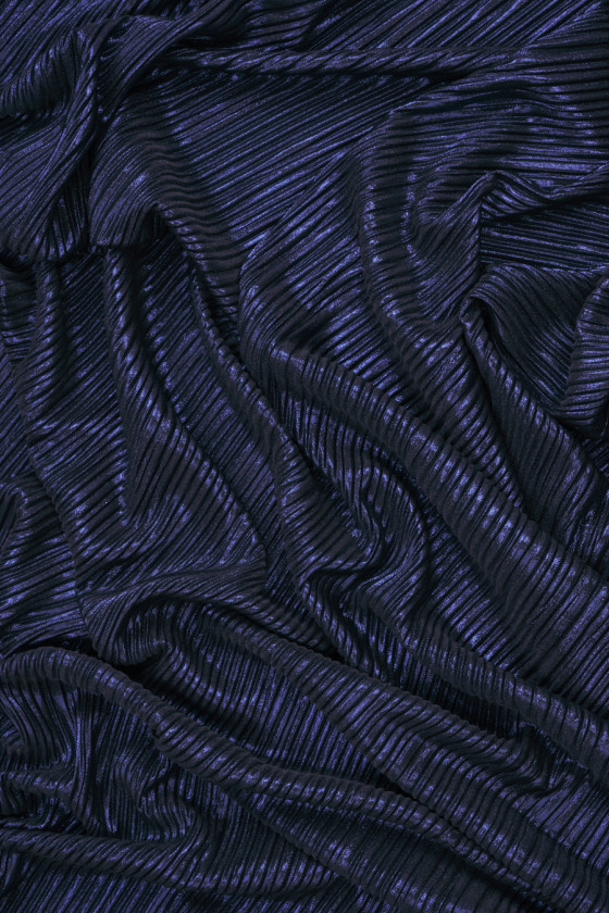 Et imponerende, skinnende stof fint plisseret i farven dyb, blækfarvet marineblå, der falder i lilla.