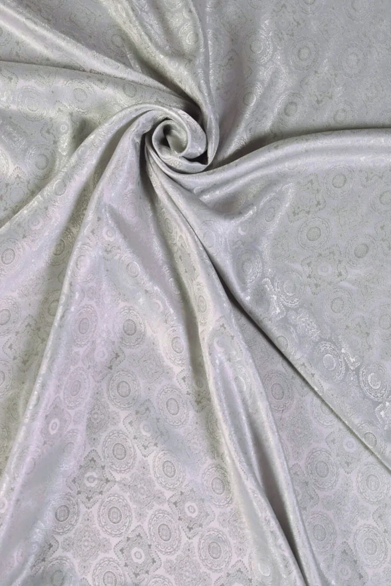 Italiensk jacquard-foring i lysegrå. Det mest fashionable mønster af orientalske ornamenter. Ikke-elastisk stof, let skinnende. Ideel til at fore frakker, jakker, veste, jakker.
