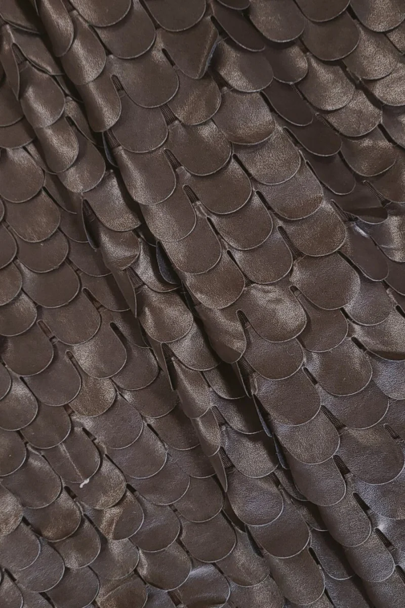 Italiensk øko-læderstof i mørkebrun. Materialet er lavet af elastisk tylnet, hvorpå stropper i form af brune øko-læderskæl sys. Skællene overlapper blidt hinanden og danner frynser. En enkelt skala er 2,5 cm bred og 3,5 cm lang. Mønsteret placeres langs stoffets længde – vi syr det i omkreds. Et meget originalt stof til at lave en kjole, nederdel eller som dekorativt element til et andet stof. På grund af meshens gennemsigtighed kræver materialet foring.