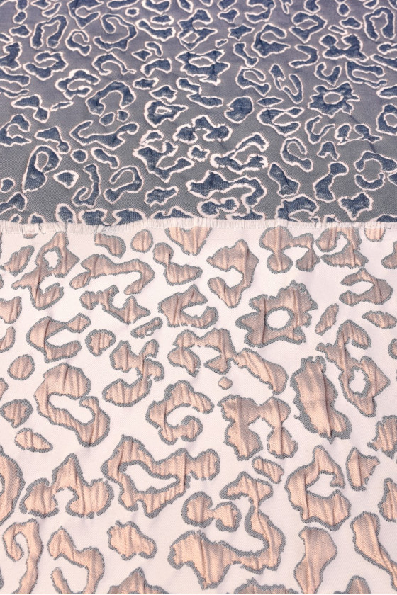 Italiensk jacquard kostume stof i creme hvid. Materialet har et meget interessant mønster, der ligner leopardprint med en størrelse på ca. 4 cm. Dyremotivet er lavet af skinnende kobberfarvet tråd og har desuden en marineblå kant. Stoffet er meget effektivt, har en let bølgepap, som giver det "fluffiness". Dens ekstraordinære formbarhed og stivhed gør den ideel til syning af tøj med konstruktion.