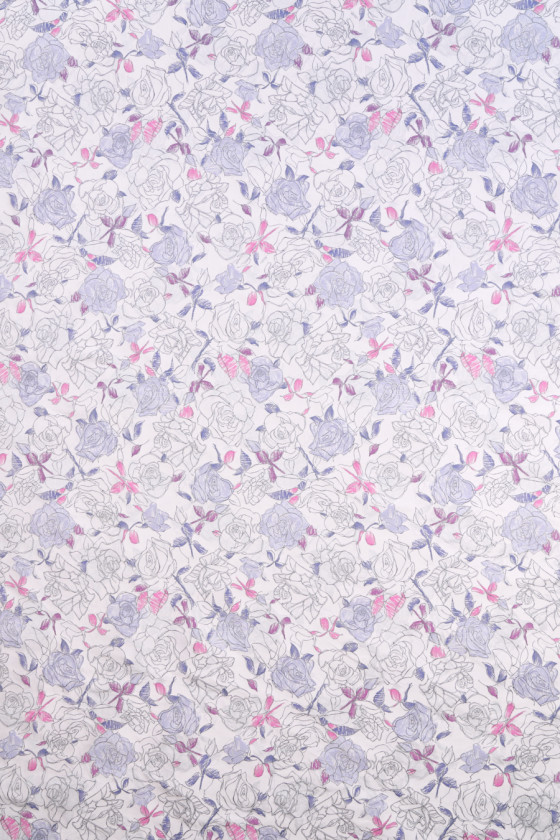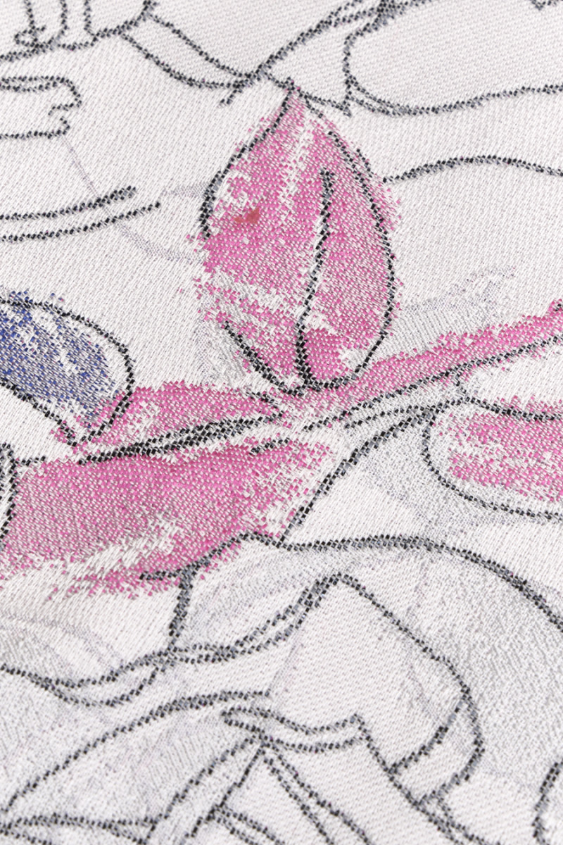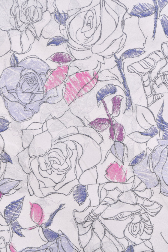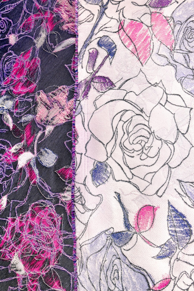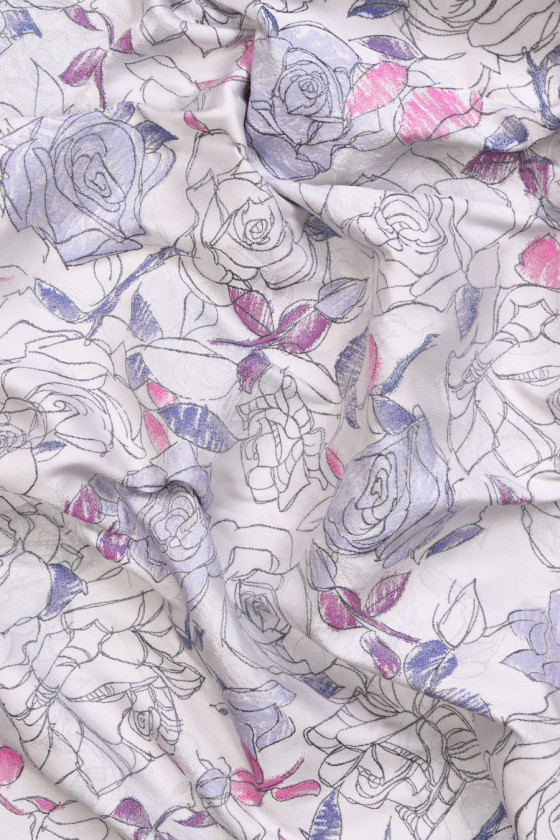 Italiensk jacquard kostume stof i lysegrå. Materialet har et meget originalt mønster af skitserede rosenblomster, skitsen er lavet af grå skinnende tråd, som tilføjer elegance til det. Nogle af blomsterne har lilla fyld, derudover er bladene farvet lyserøde, lilla og marineblå. Venstre side af stoffet er også meget effektivt og kan bruges. Materialet har en tæt vævning, er uelastisk og stift. Et godt forslag til syning af et kostume, kjole, nederdel eller til dekorative formål.