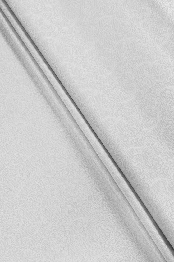 Italiensk jacquardkostume med Paisley-motiv i lysegrå. Stoffet er tyndt, lidt stift, meget elastisk. Perfekt til syning af kjole, kostume, nederdel eller til dekorative formål. Komposition: 100% polyester