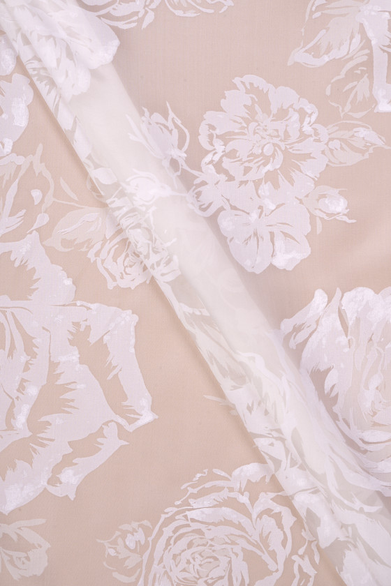 Italiensk 100% creme organza silke stof med uigennemsigtige creme rosenblomster. Naturlig silkeorganza er et tyndt, gennemsigtigt, men stift stof med en delikat glans, der er karakteristisk for silkestoffer. Perfekt til syning af kjole, bluse, skjorte, nederdel.