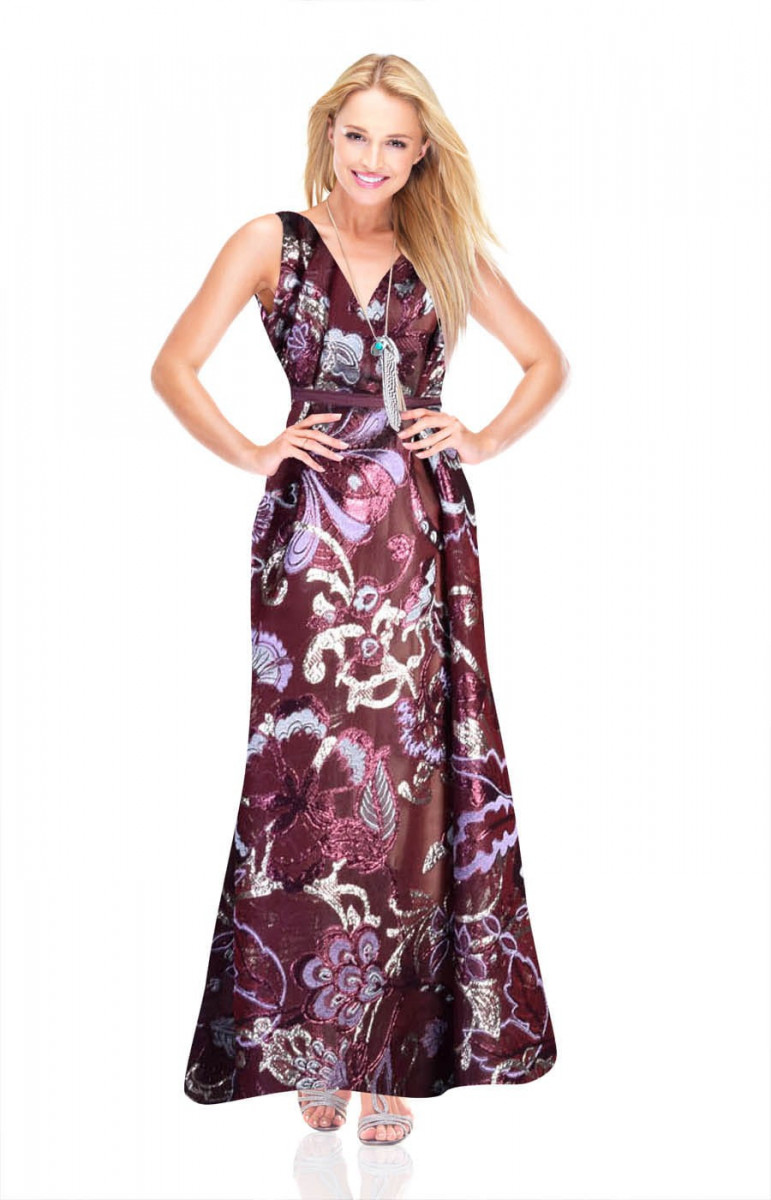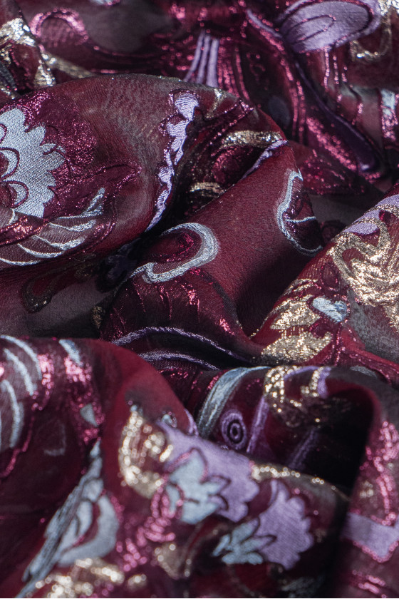 Italiensk, elegant organza-stof med jacquardmønstre. Et meget eksklusivt produkt lavet af natursilke i bordeaux med polyester, orientalsk broderi i bordeaux og lyng, dekoreret med en skinnende tråd. Organza er tynd og transparent, men samtidig stiv, hvilket giver stoffet lethed og det rige mønster gør det til et fantastisk forslag til at sy en fænomenal kjole, bluse eller nederdel.