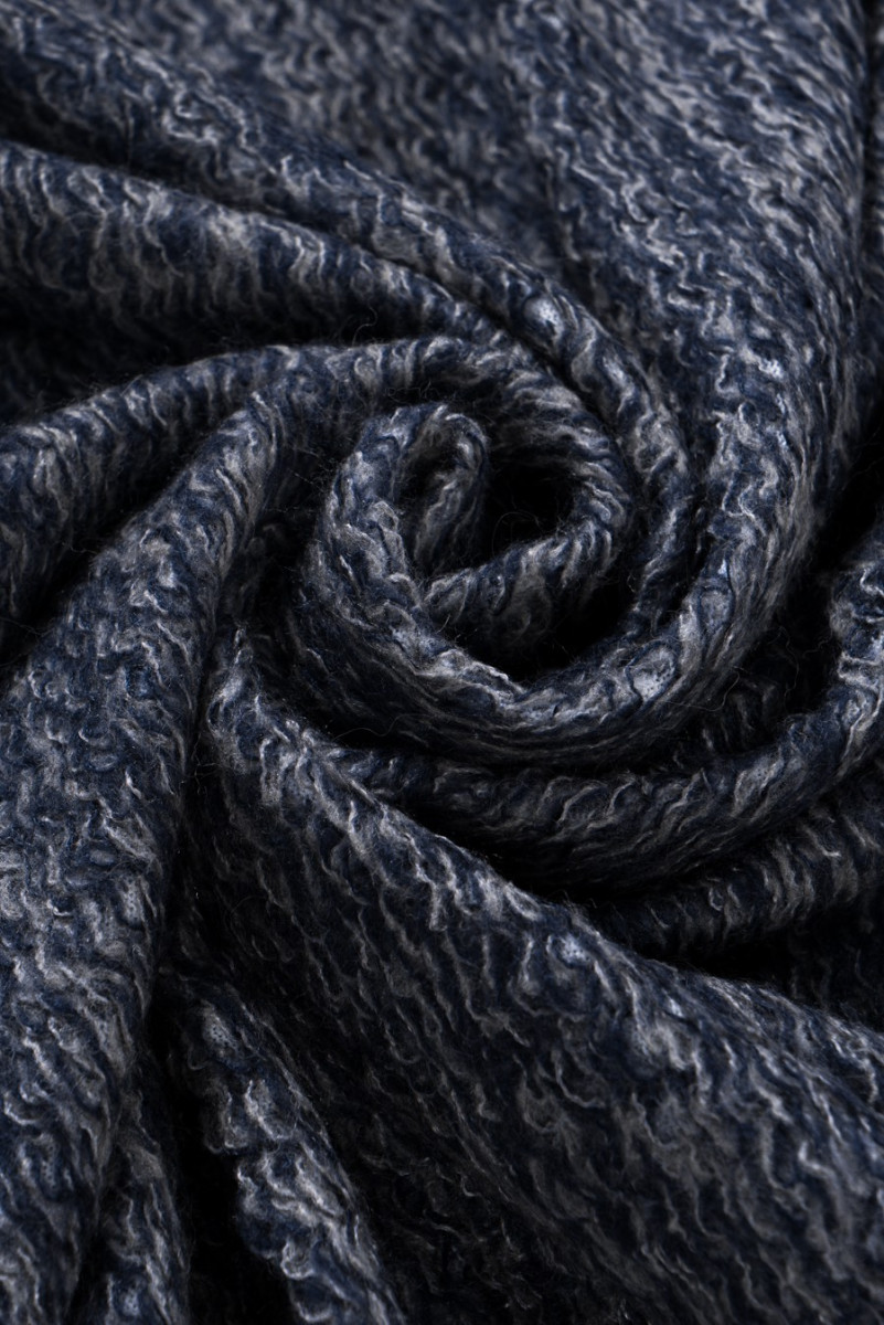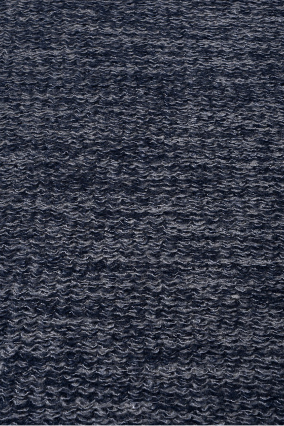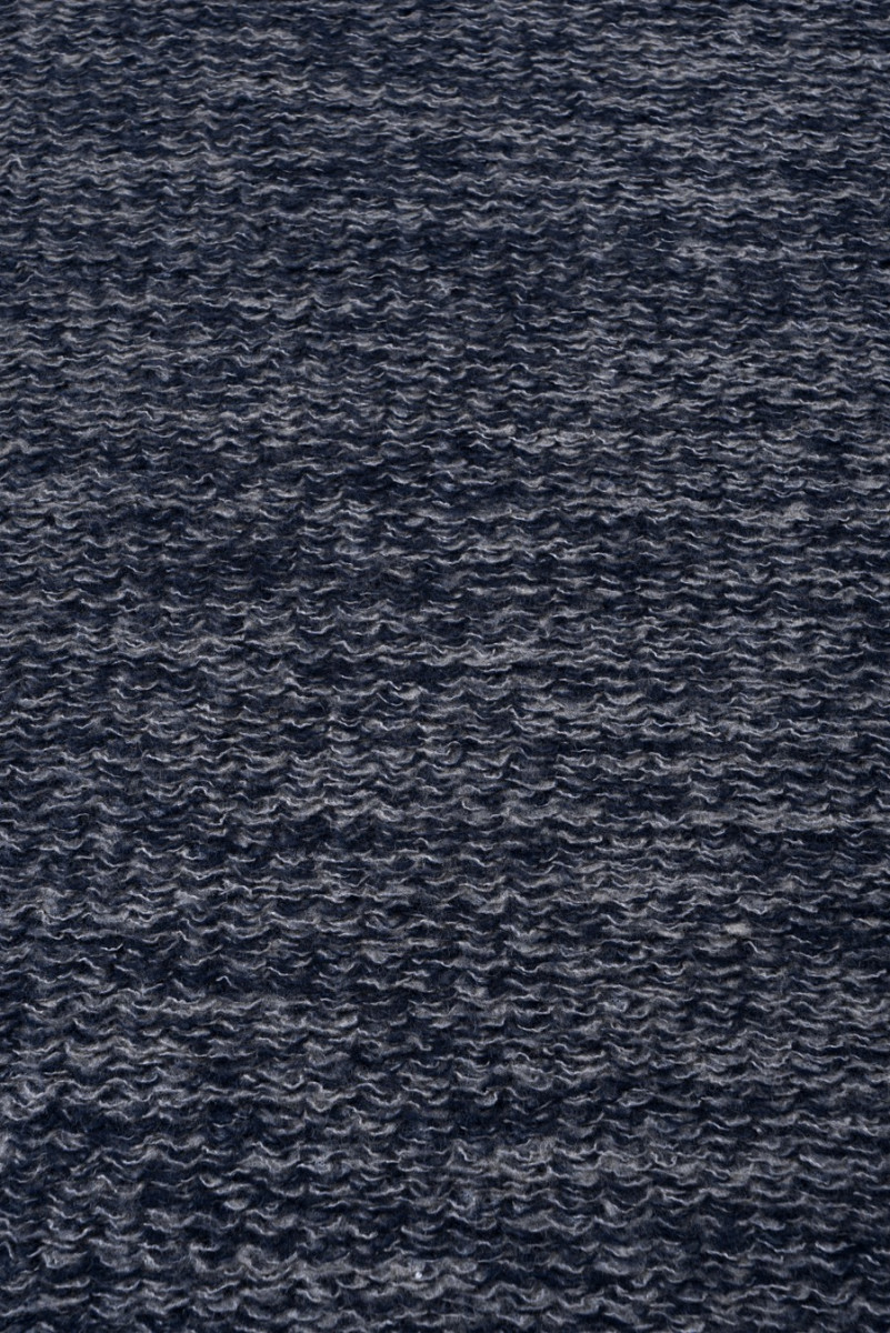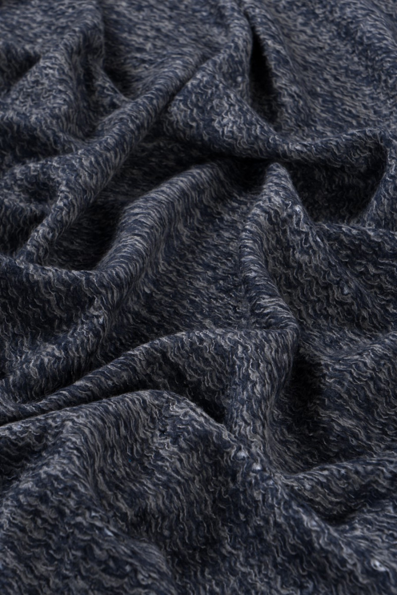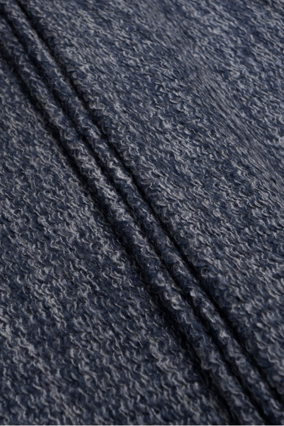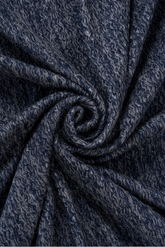 Sweater strikket stof bestående af 2 lag - et stramt bundlag lavet af akryl i ecru farve og et øverste lag løst vævet af uldtråde i grå og marineblå (meleret effekt). Vi anbefaler at sy løse cardigans, trøjer eller som et dekorativt stof af det.