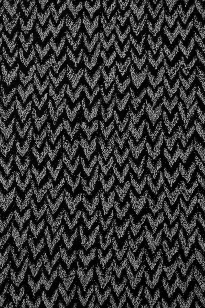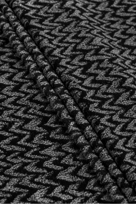 Italiensk kostumestof i sorte og grå uregelmæssige zigzags, vævet af naturlig uld med en blanding af polyester.