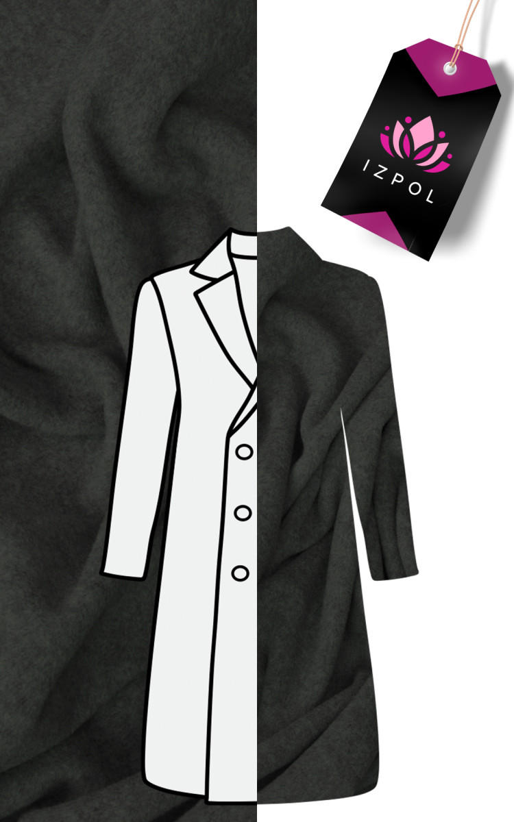 Italiensk frakkestof vævet af naturlig uld med tilsætning af polyamid i grafitfarve. Uldstoffer er ideelle til overtøj (frakke, jakke, vest), fordi de varmer og samtidig tillader huden at trække vejret.