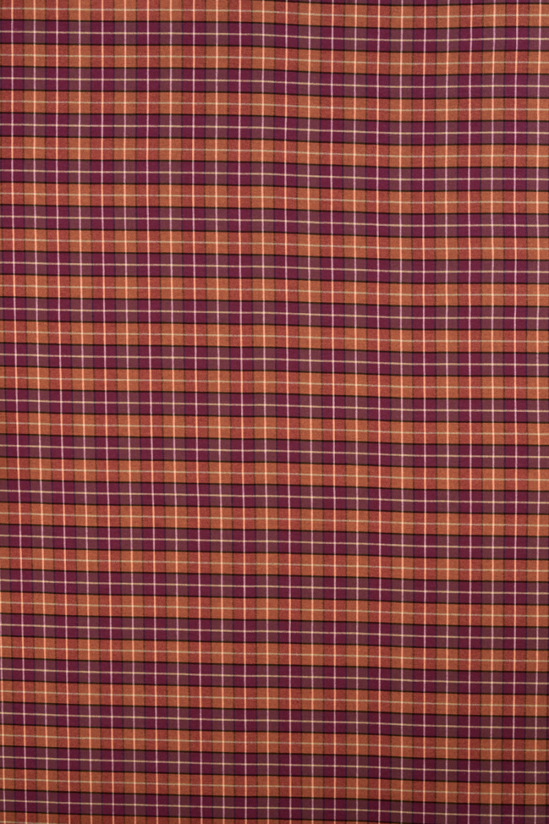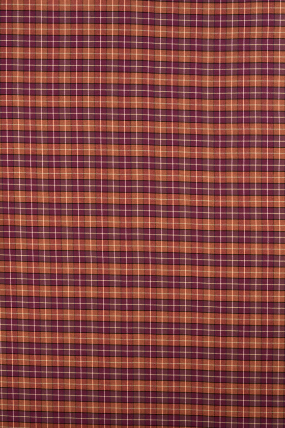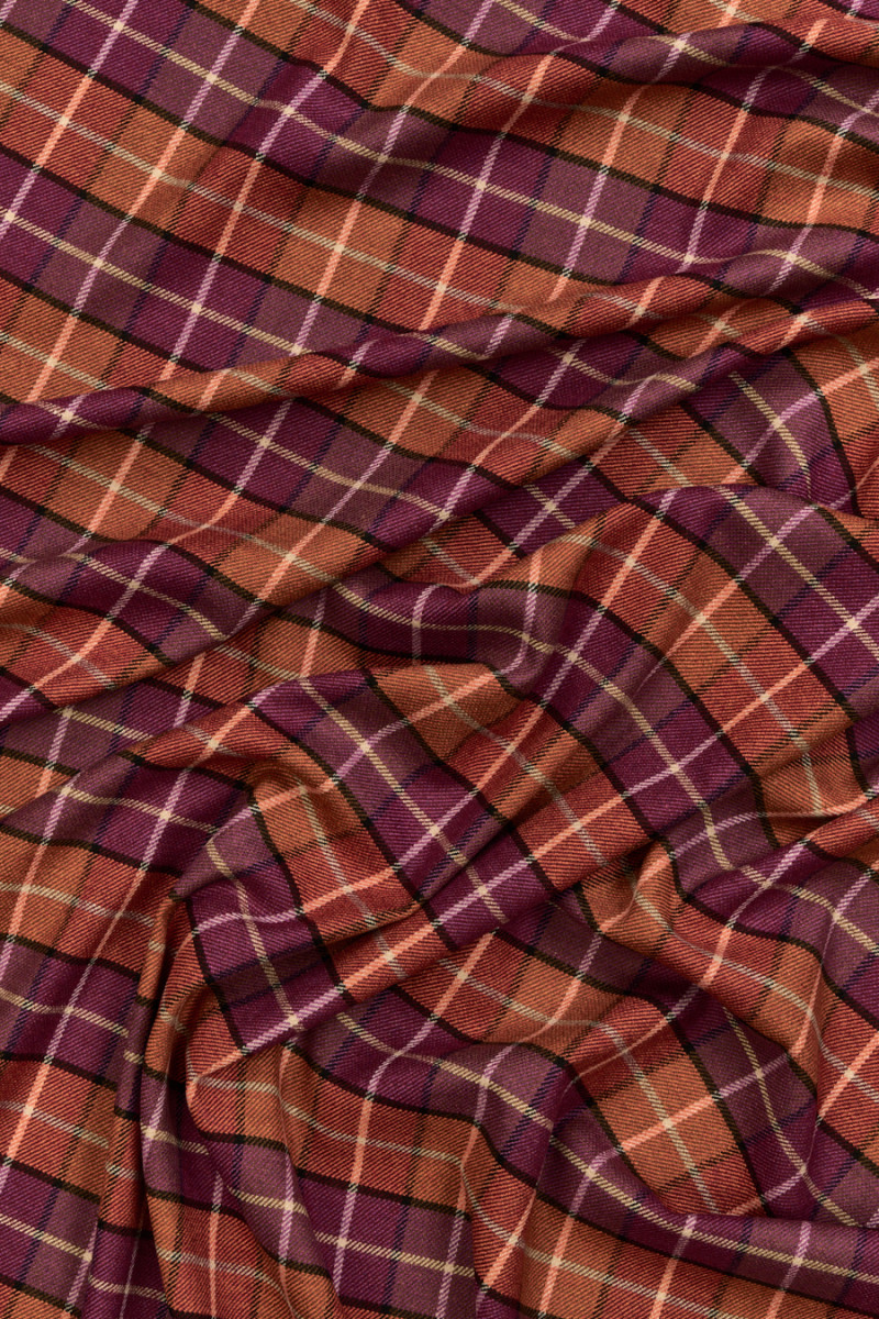 Italiensk kostumestof fra efterår-vinter kollektionen, vævet af uld og polyester med et orange og lilla ternet motiv. Et almindeligt mønster bestående af firkanter placeret ved siden af hinanden med en størrelse på 2 cm * 2 cm. Stoffet er af medium tykkelse, blødt, behageligt at røre ved og fleksibelt. Den er lavet i en delikat twillvævning. Et tidløst forslag, der vil være perfekt til at sy en nederdel, kjole samt bukser og en jakke.