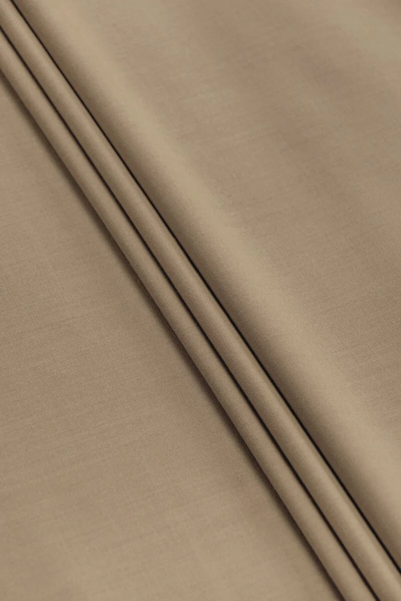 Italiensk kostumestof lavet af naturlig uld med en blanding af elastan i jordagtig beige. Stoffet er tykkere med en fint struktureret vævning, elastik. Den er perfekt til at sy efterårs- og vintertøj som: kjole, nederdel, jakke. Et fantastisk tilbud for folk, der værdsætter gode typer stoffer.