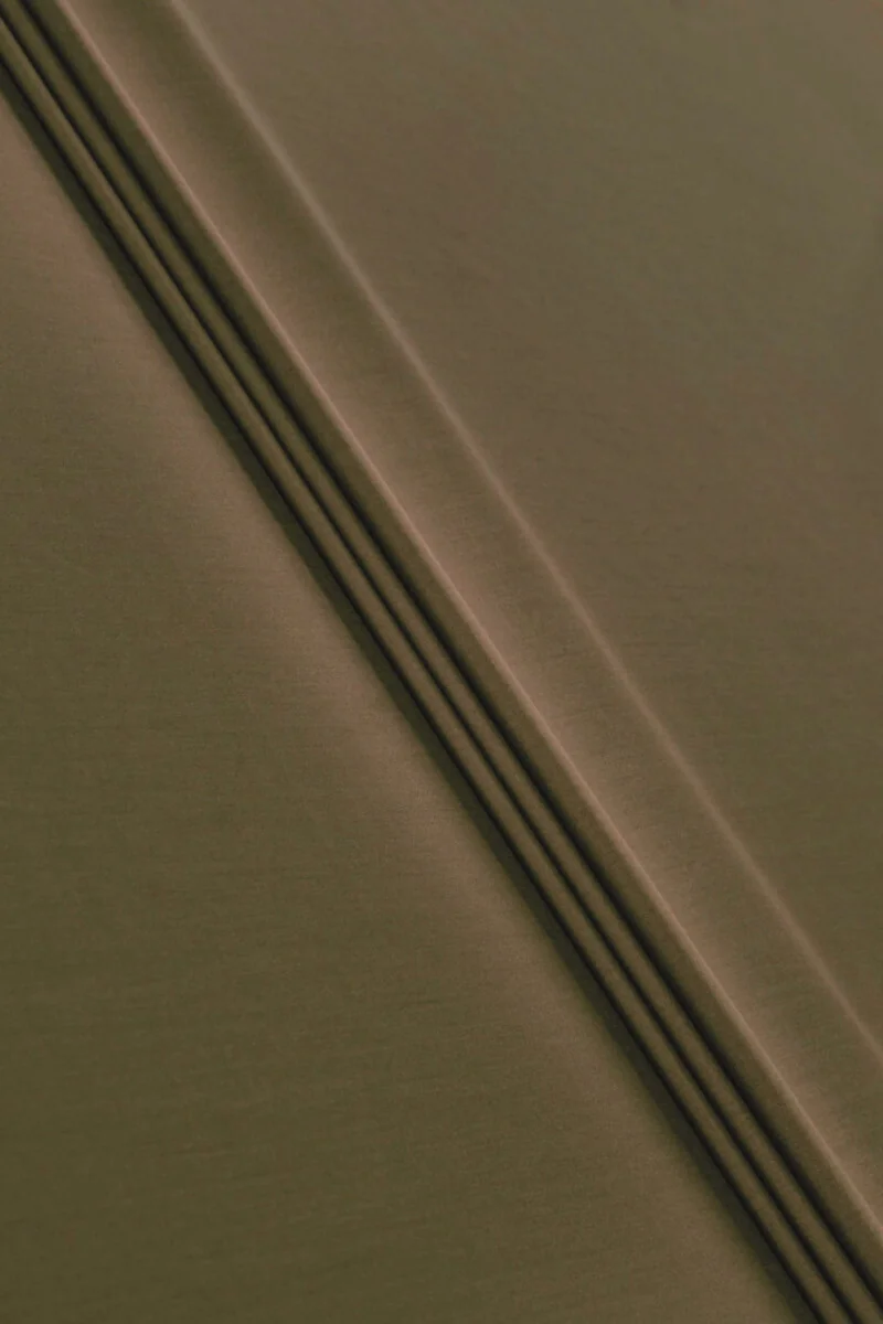 Italiensk kostumestof lavet af 100% naturlig uld. Materialet er vævet af to farver rød og grå-olivenfarvet tråd, som skaber en tofarvet effekt. Stoffet er ikke-elastisk, medium tykkelse med en glat, ædelt skinnende vævning. Den er perfekt til at sy et klassisk jakkesæt, kjole, nederdel eller bukser. Naturligt stof i en original farve til folk, der kan lide mørke farver.