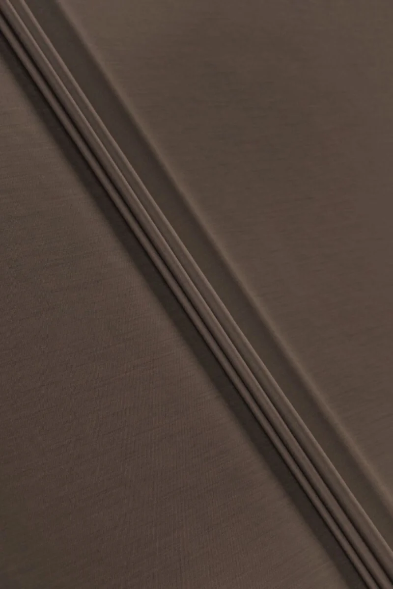Italiensk kostumestof lavet af naturlig vergin-uld med en blanding af silke. Materialet er vævet af to farver brune og mørkegrå tråde, som skaber en tofarvet effekt. Stoffet er ikke-elastisk, medium tykkelse med en glat vævning. Tilsætningen af silke giver den adel og en delikat glans. Den er perfekt til at sy et klassisk jakkesæt, kjole, nederdel eller bukser. Naturligt stof i en original farve til folk, der kan lide interessante farver.