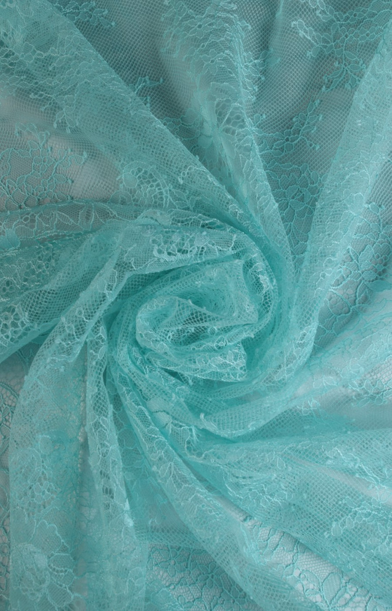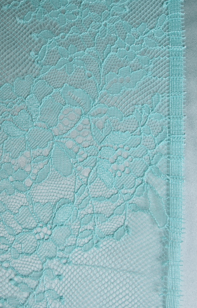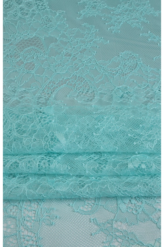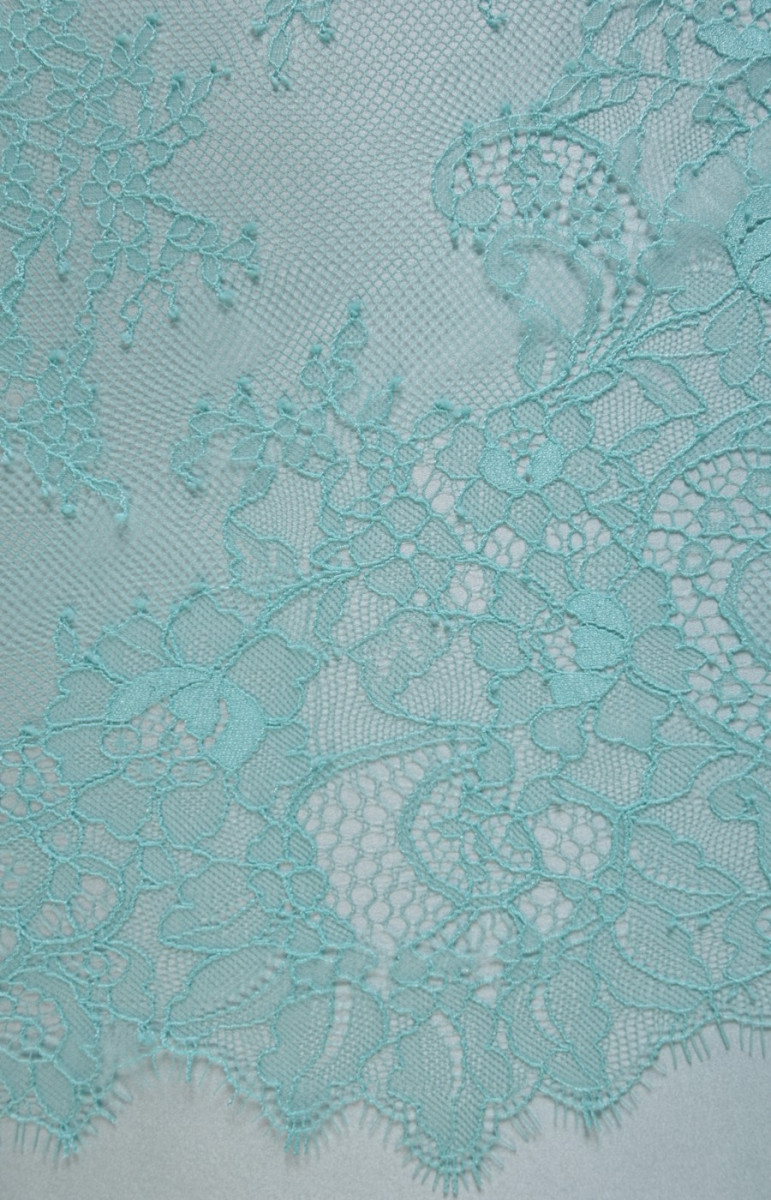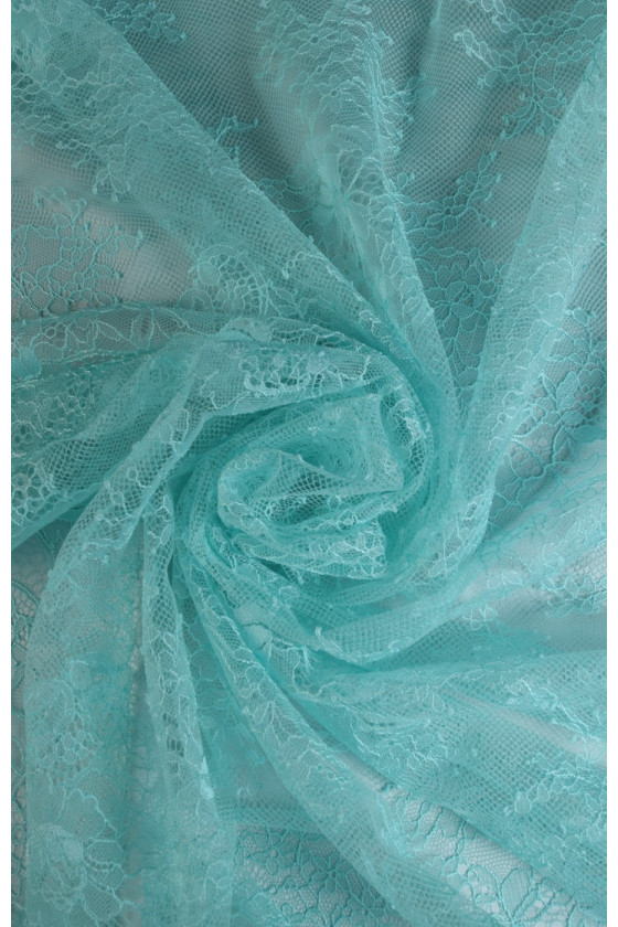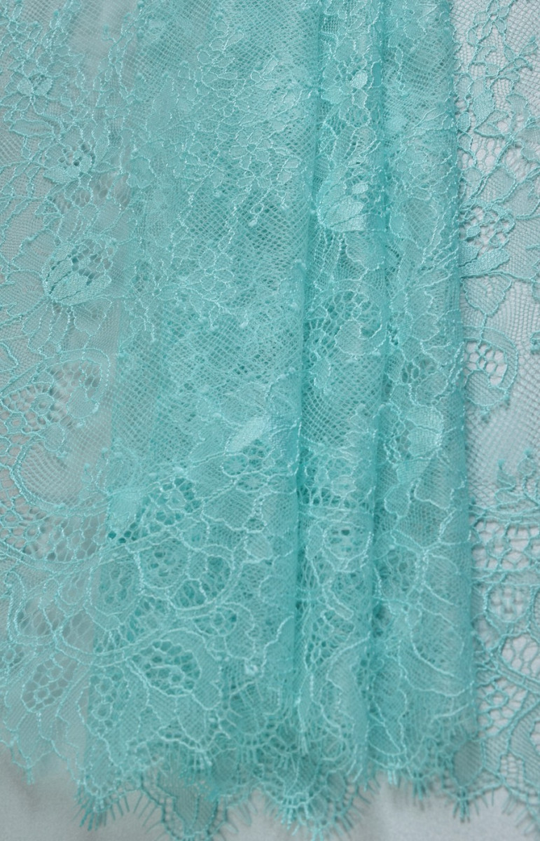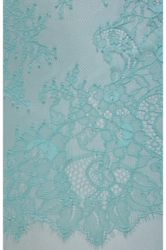 Delikate franske blonder i lys turkis, 70 cm bred. Blonderne er bløde, behagelige at røre ved, passer pænt. Vi anbefaler det til bluser, indlæg, elegant undertøj.