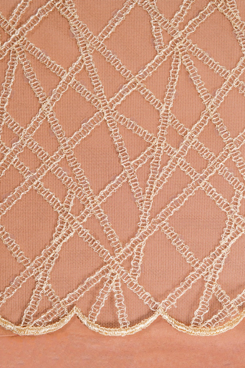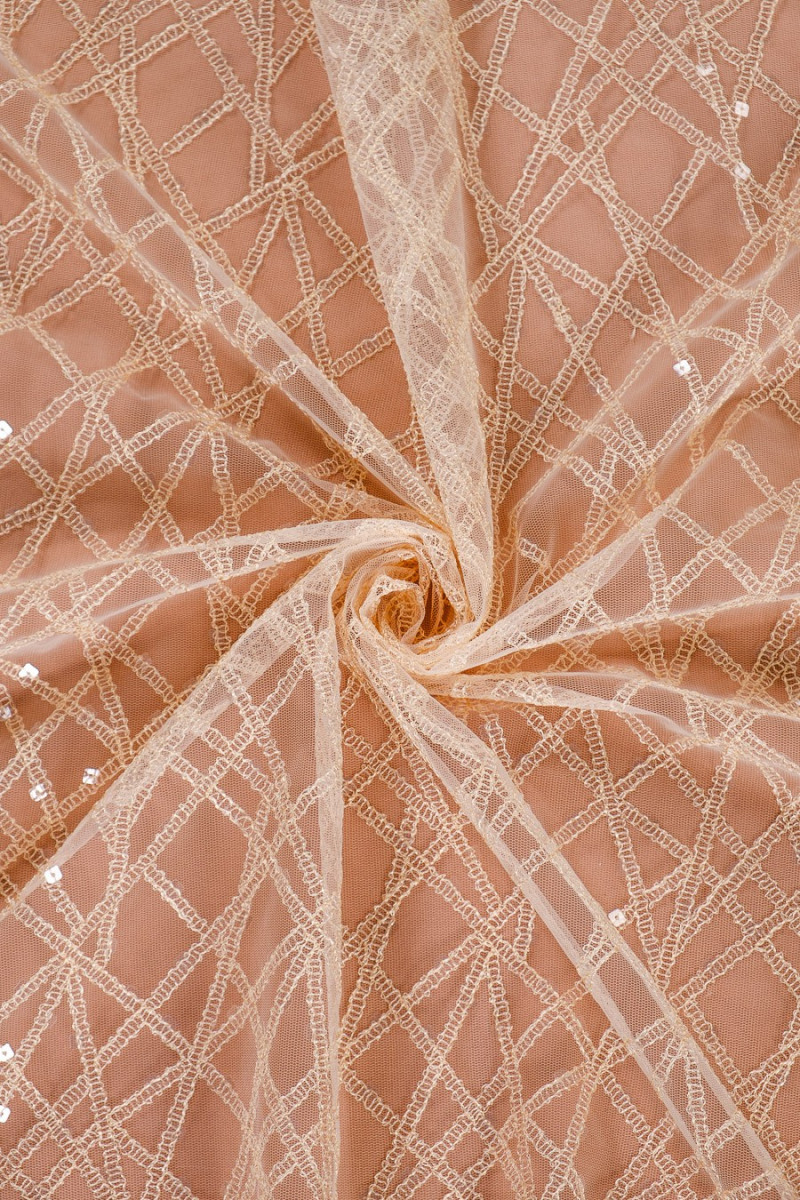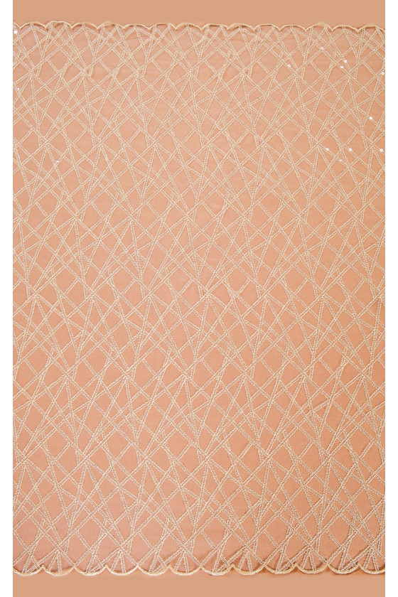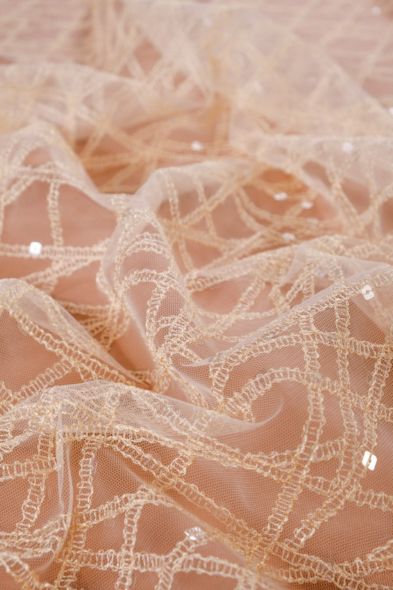 Italiensk blonde i lys beige med et interessant geometrisk motiv dekoreret med gennemsigtige pailletter. Kronen er afsluttet på begge sider med en tand. Perfekt til syning af bluse, kjole, nederdel.