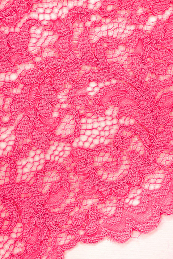 Italiensk blonder i hot pink - pink. Stoffet har et tæt blomstermotiv forbundet med mesh og færdig med en ledning. Kronen er færdig med en dekorativ tand på begge sider - vi syr den omkreds. Et meget flot forslag til folk der kan lide stærke sommerfarver.