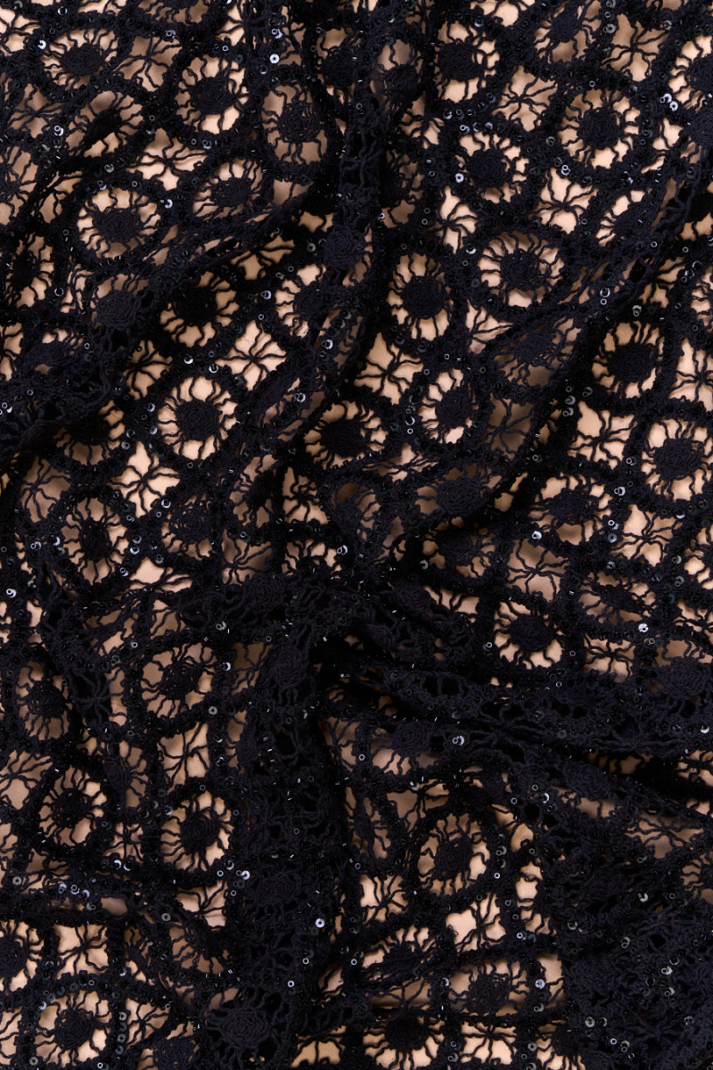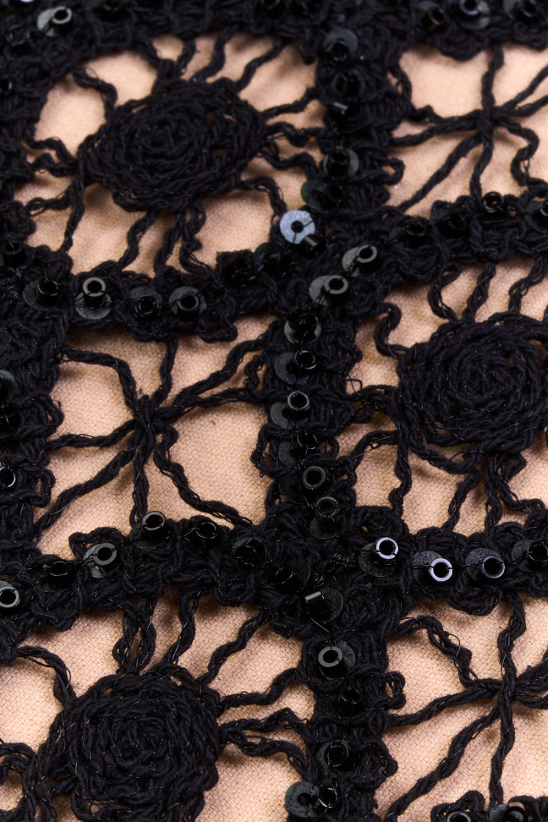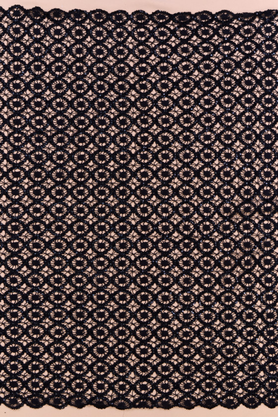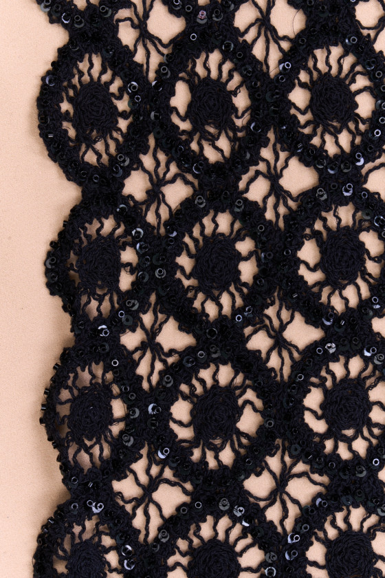 Italiensk blonde med gennembrudt mønster i sort dekoreret med sorte perler og pailletter. Stoffet er blødt, gennemsigtigt, ikke-elastisk og har en delikat glans takket være de anvendte perler. Fantastiske blonder, som har mange anvendelsesmuligheder, kan bruges til at fremtrylle kjoler, bluser, nederdele, toppe og også bruges til finish.