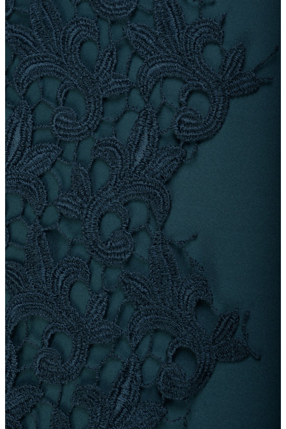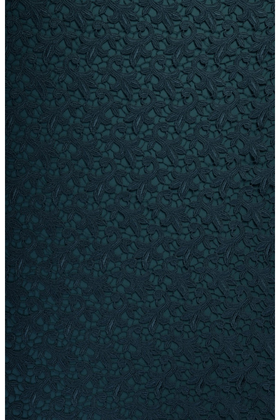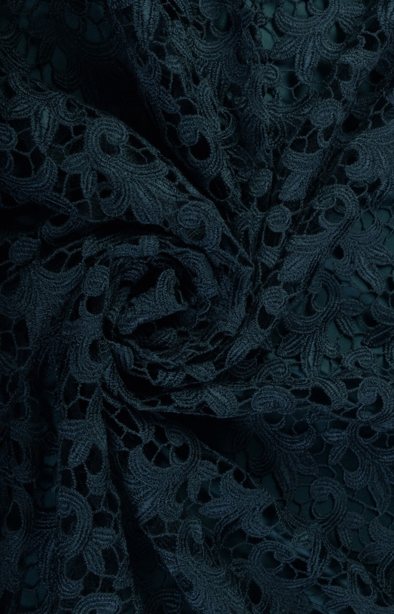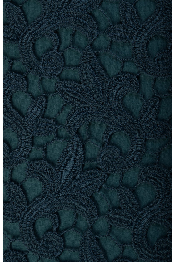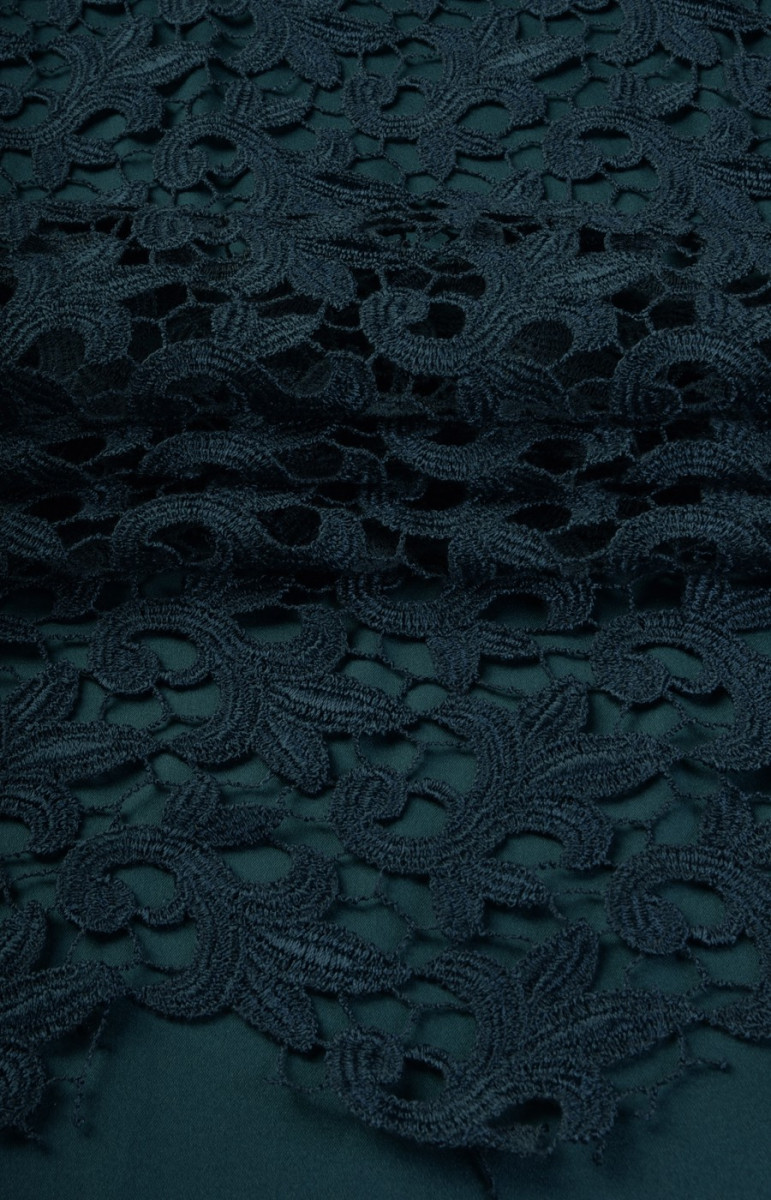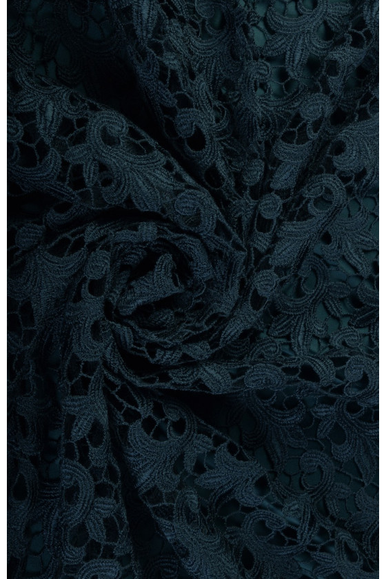 Guipira blonde med blomstermønster i mørk turkis. Perfekt til nederdele, kjoler.