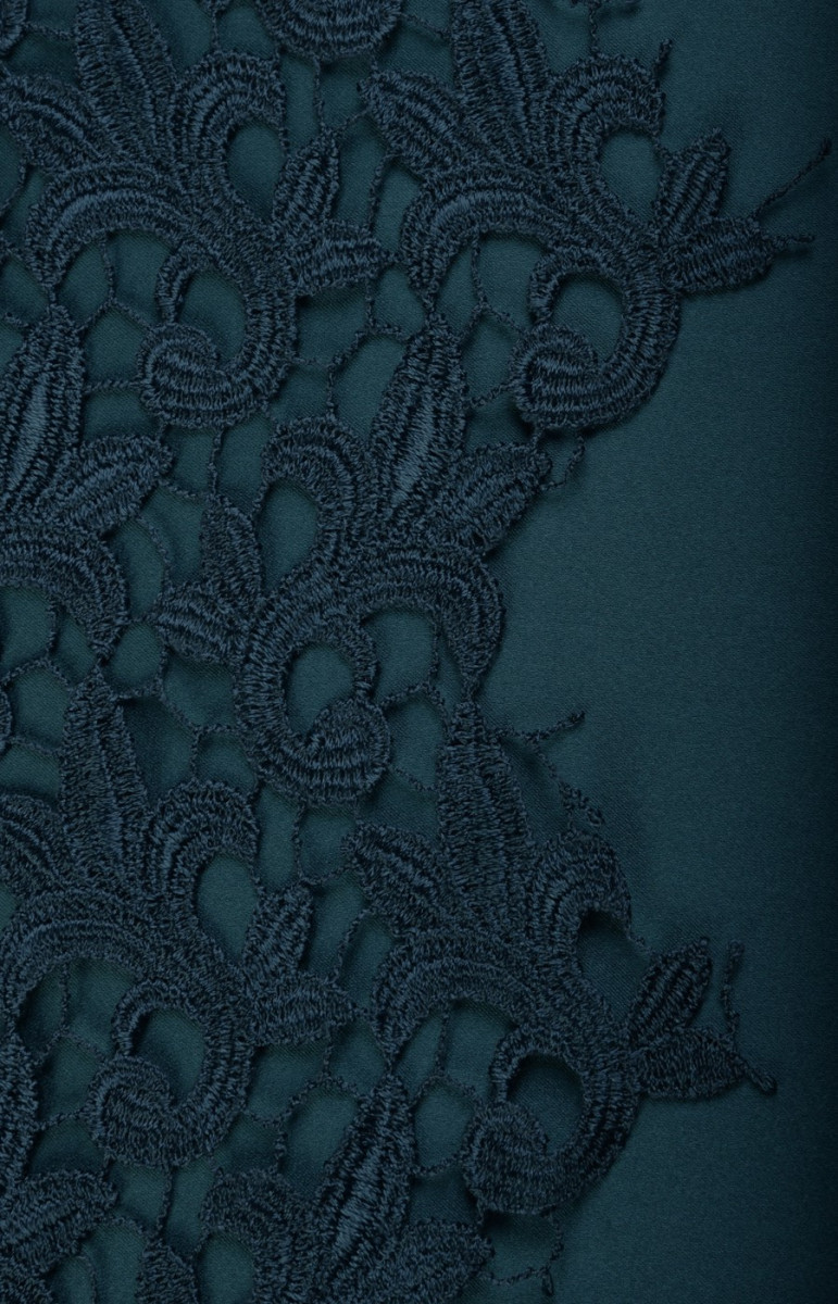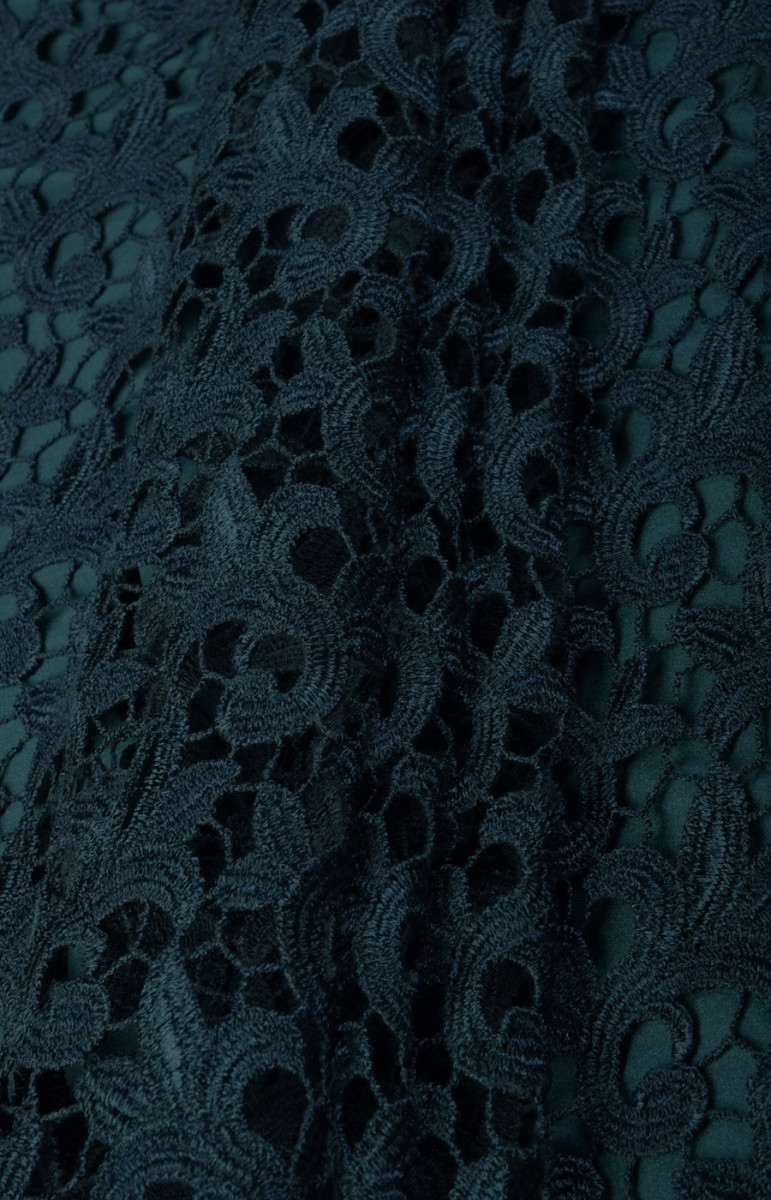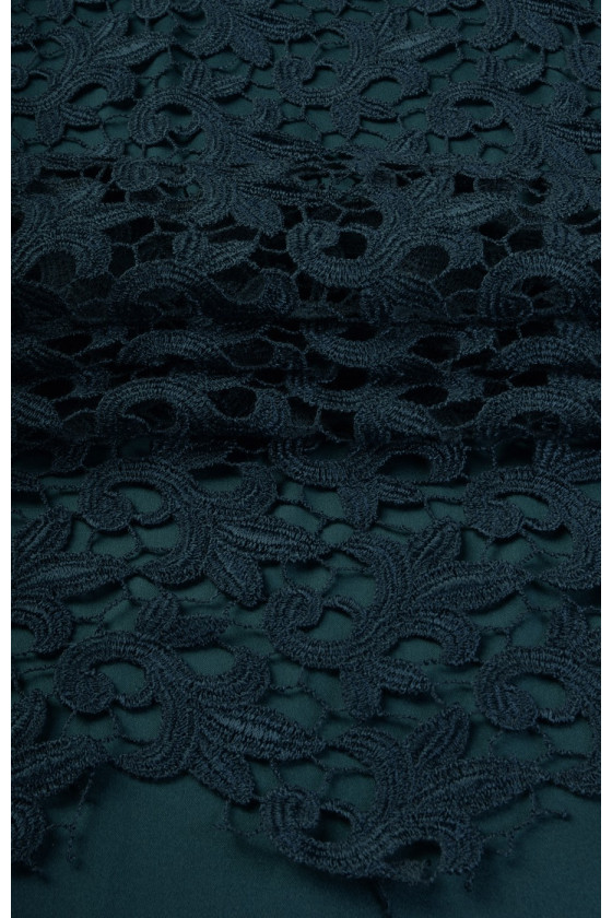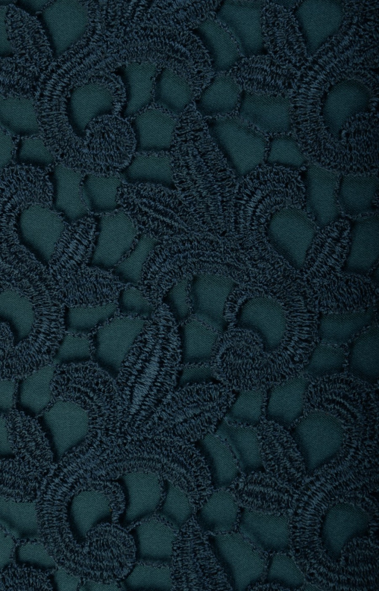 Guipira blonde med blomstermønster i mørk turkis. Perfekt til nederdele, kjoler.