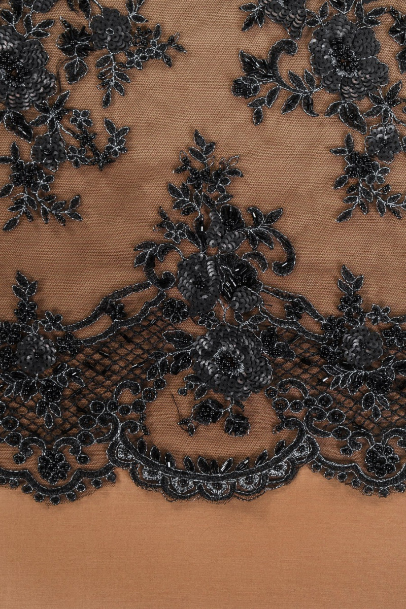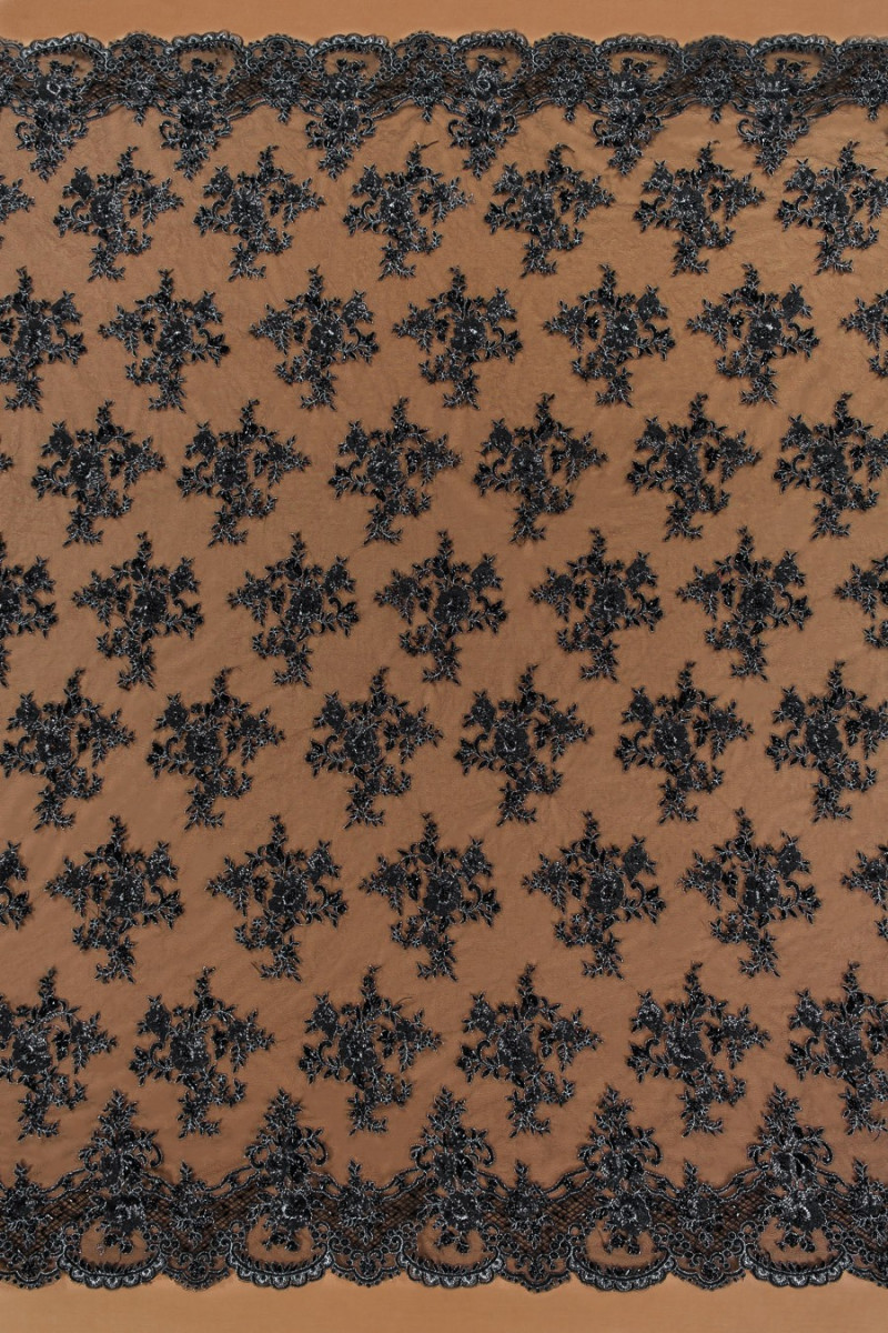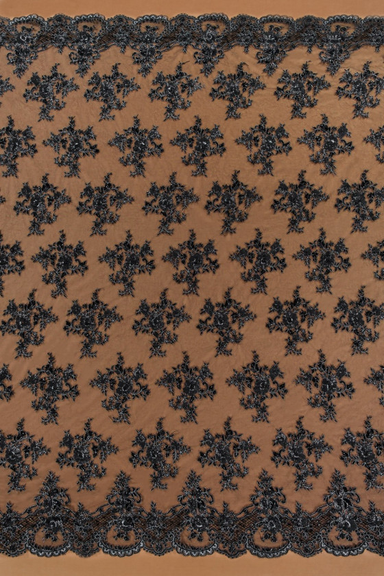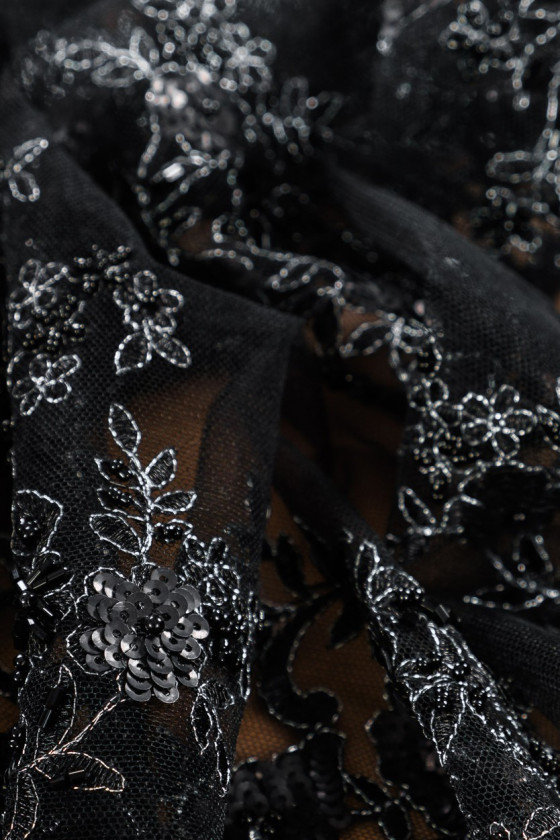 Smuk sort blonder broderet med pailletter og perler og trimmet med sølv lurex tråd. Færdig med en tand på begge sider. Perfekt til en aftenkjole.