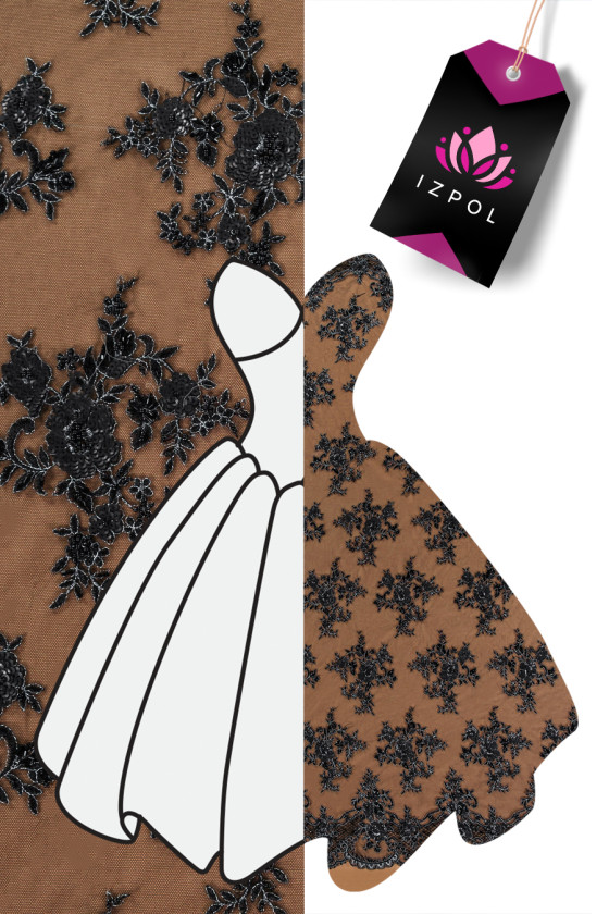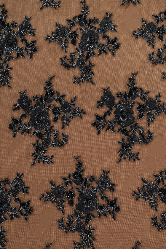 Smukke sorte blonder broderet med pailletter og perler og trimmet med sølv lurex tråd. Afsluttet med en tand på begge sider. Perfekt til en aftenkjole.