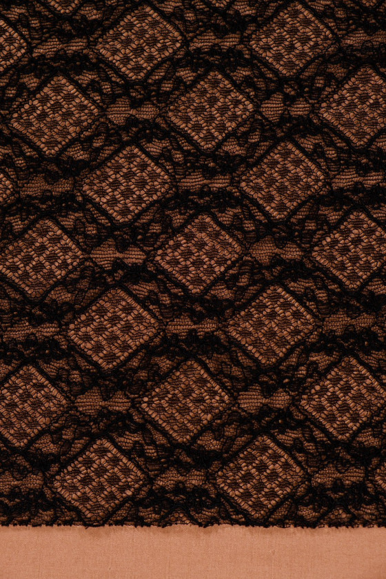Delikat blonder i sort med et meget interessant, tæt, geometrisk mønster. Kronen er fleksibel - den er ikke færdig med en dekorativ tand. Stoffet er 90 cm bredt.