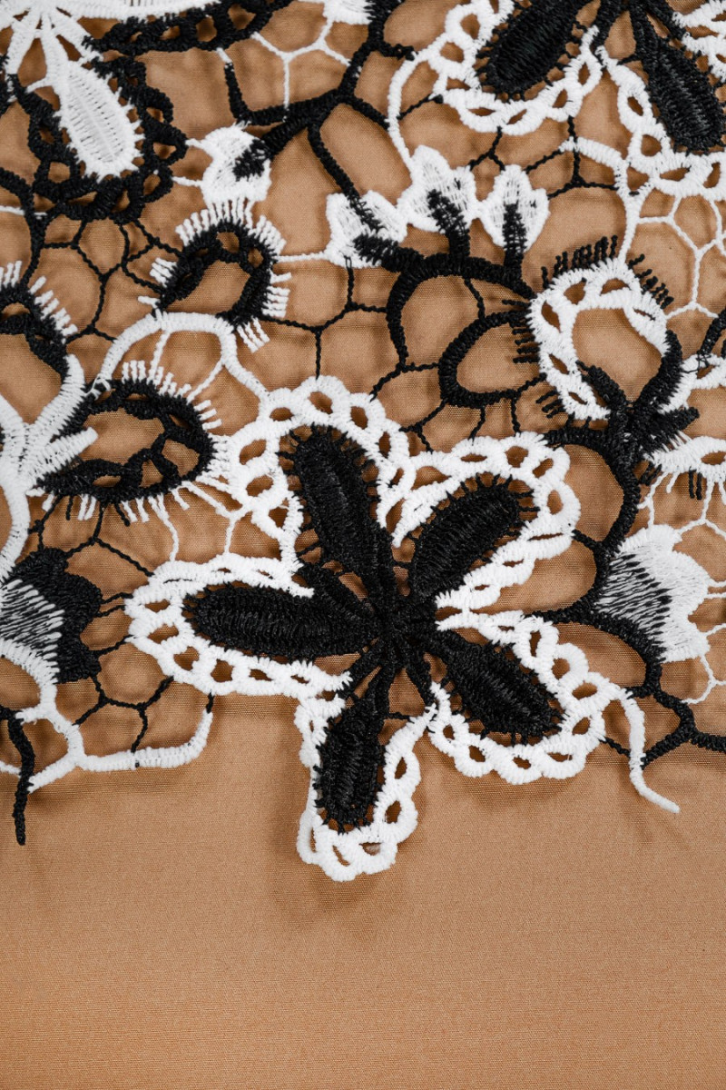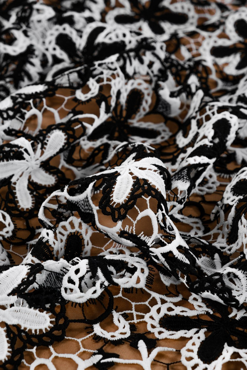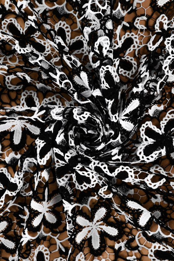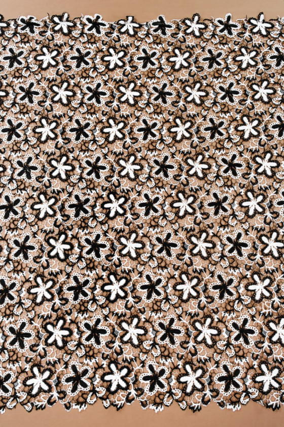 Smuk, tofarvet guipure blonder. Ikke-elastisk stof, færdig på begge sider med en tand. Perfekt til kjoler eller bluser