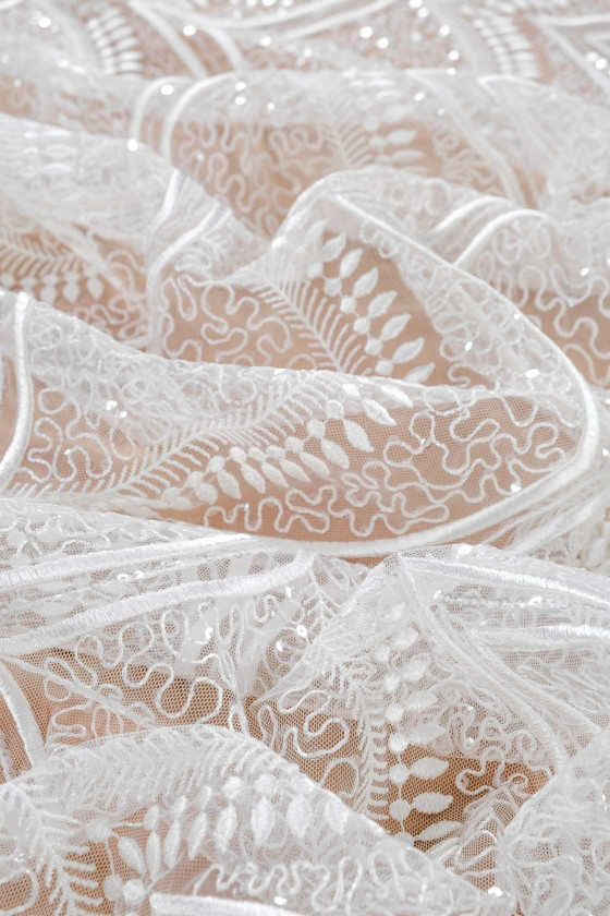 En smuk råhvid krone med en tandfinish på den ene side. Tanden er ca. 20 cm bred. Broderet med perler og pailletter. Stoffet er perfekt til brudekjoler og bluser.