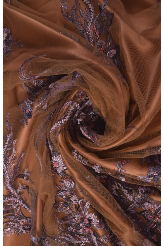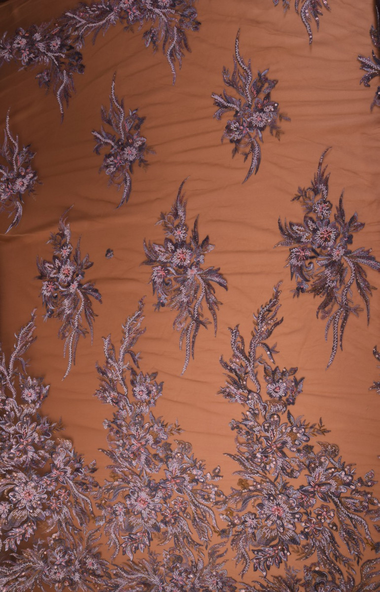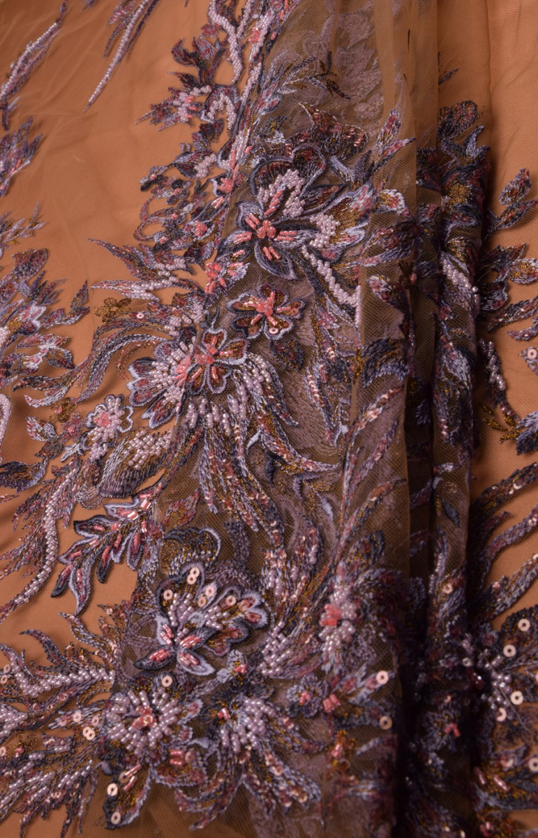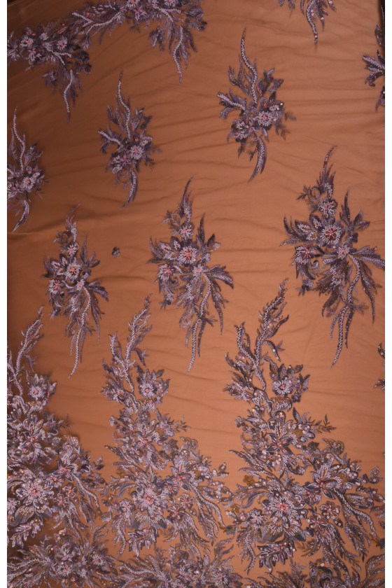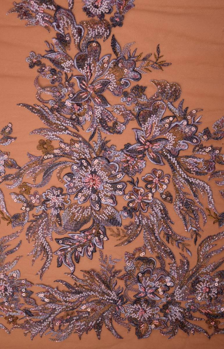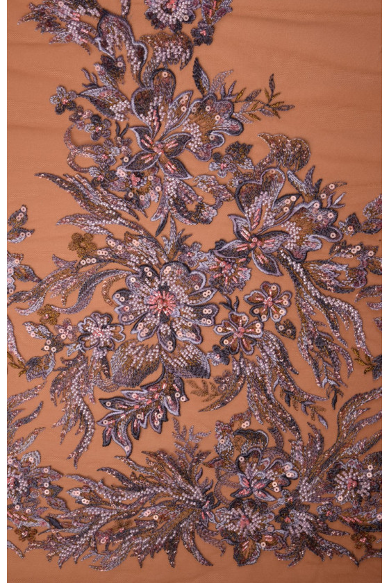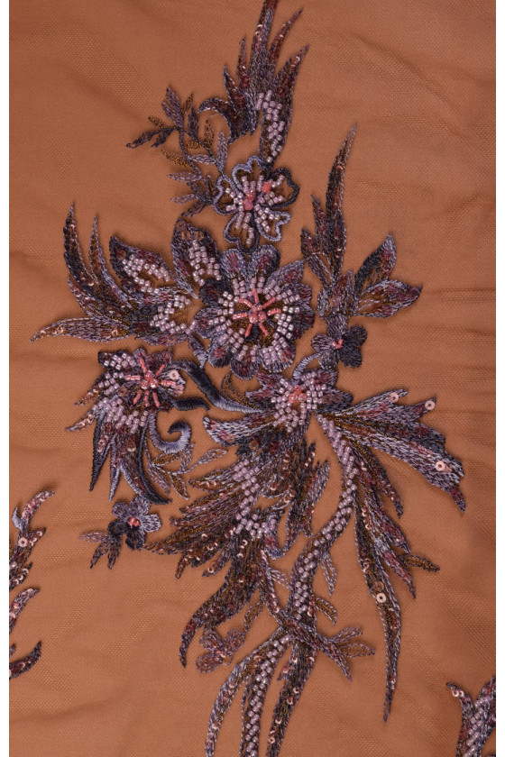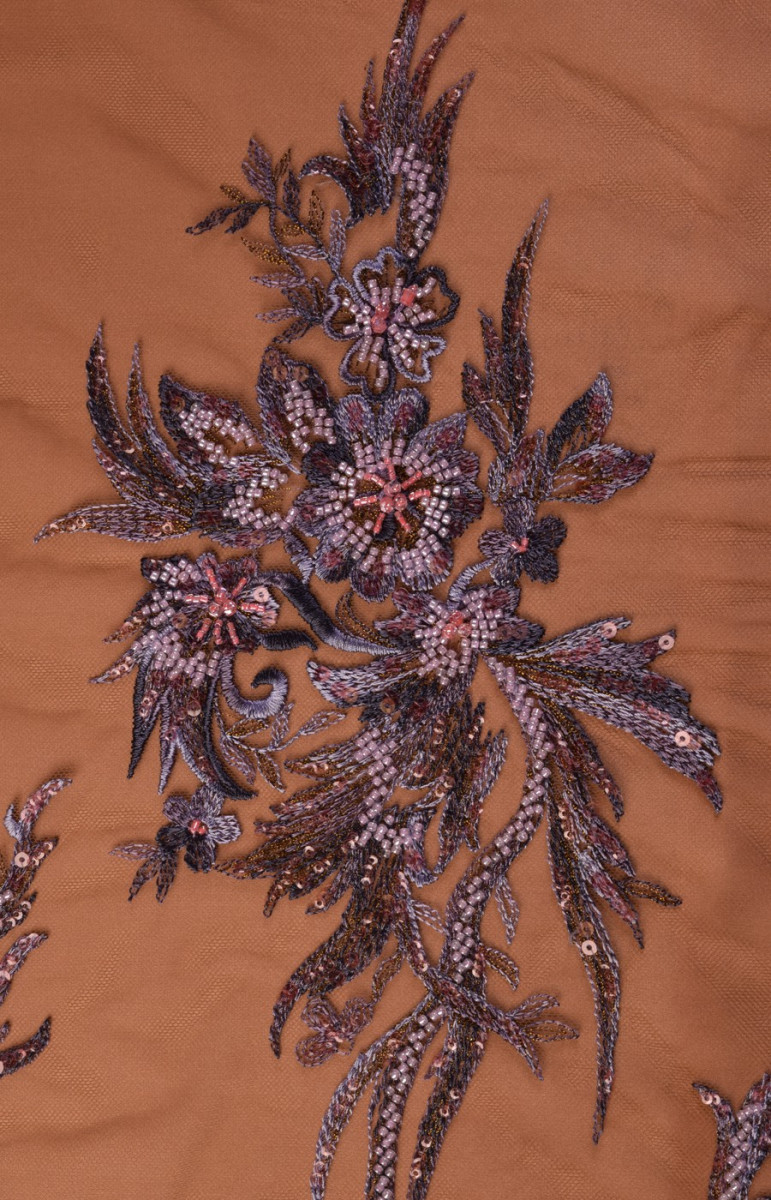 Blonder broderet med perler og pailletter med et voksende mønster. Mulighed for at skære applikationer (størrelse ca. 30 cm) og sy på andre stoffer. Mønsteret nederst er ca. 60 cm højt. Farver: lilla /lilla/pink mønster på nude tyl. Vi anbefaler at matche den med silkesatin
