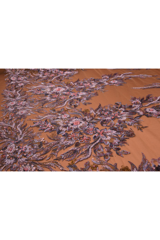 Blonder broderet med perler og pailletter med et voksende mønster. Mulighed for at skære applikationer (størrelse ca. 30 cm) og sy på andre stoffer. Mønsteret i bunden er ca. 60 cm højt. Farver: lilla / lilla / lyserødt mønster på nøgen tyl. Vi anbefaler at matche det med silkesatin