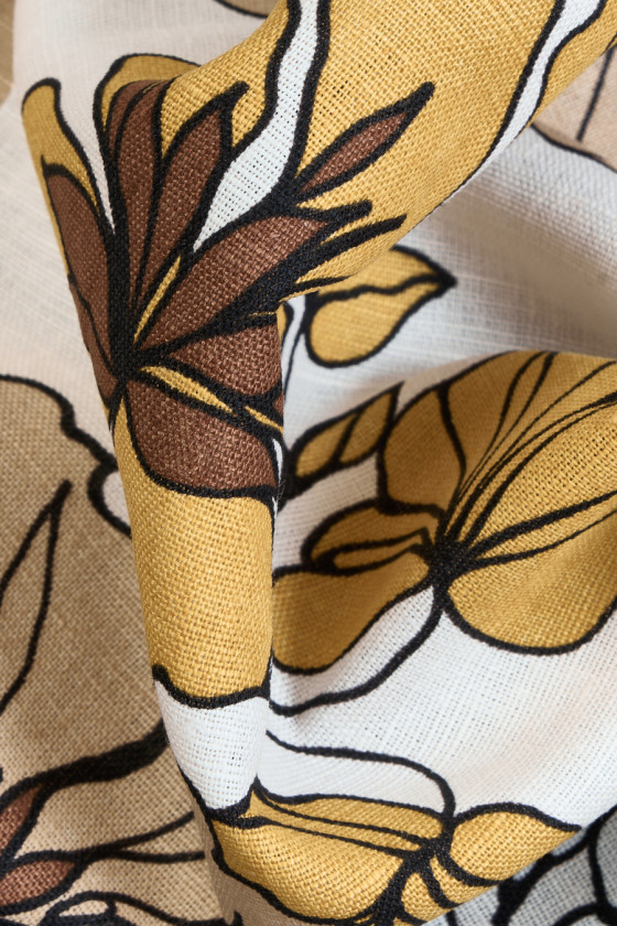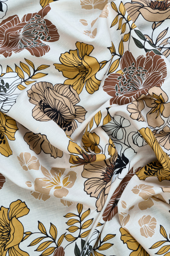 Italiensk linnedstof med en blanding af bomuld i ecrufarve med store blomster i beige, brun, hvid og gul. Blomsterne er af forskellig størrelse, med en stor overvægt af større blomster. Stoffet er tyndt, men uigennemsigtigt, blødt, beregnet til sommerkjoler, nederdele og skjorter.