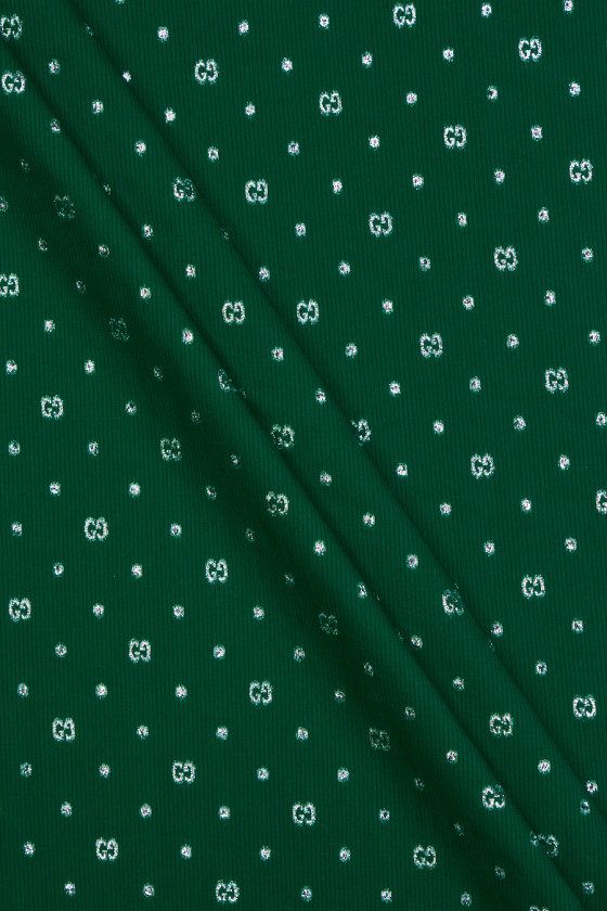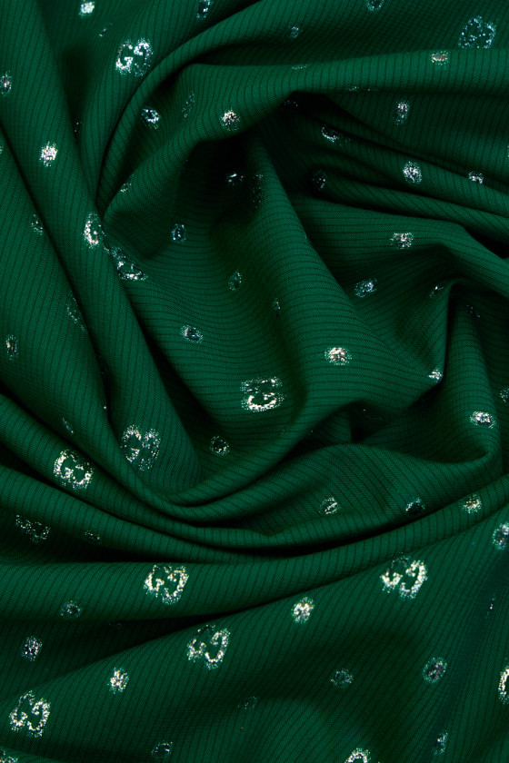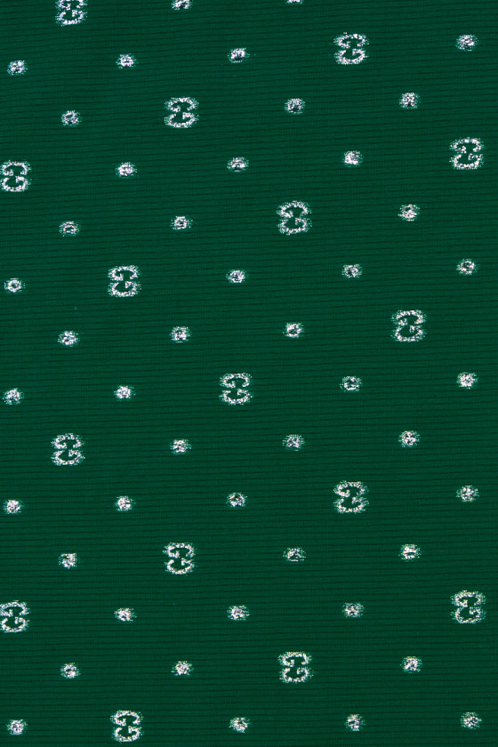 Skjortestof i grøn med motiv af små, tæt placerede striber. Det hele er regelmæssigt dekoreret med prikker og bogstaver lavet af sølv, skinnende tråd. Stoffet er tyndt, men uigennemsigtigt, blødt, ikke-elastisk og kommer fra samlingen af en kendt modedesigner, på grund af arrangementet af mønsteret anbefaler vi omkredssyning. Et ideelt forslag til skjorter, bluser og lette kjoler.