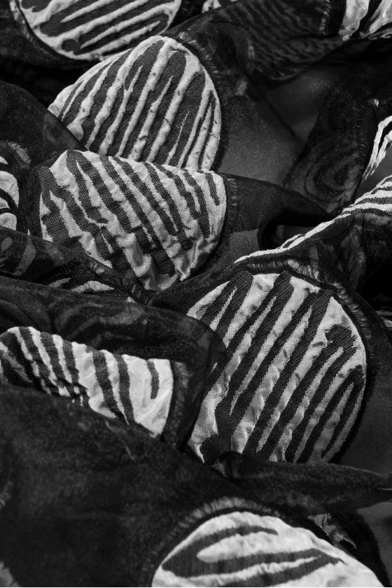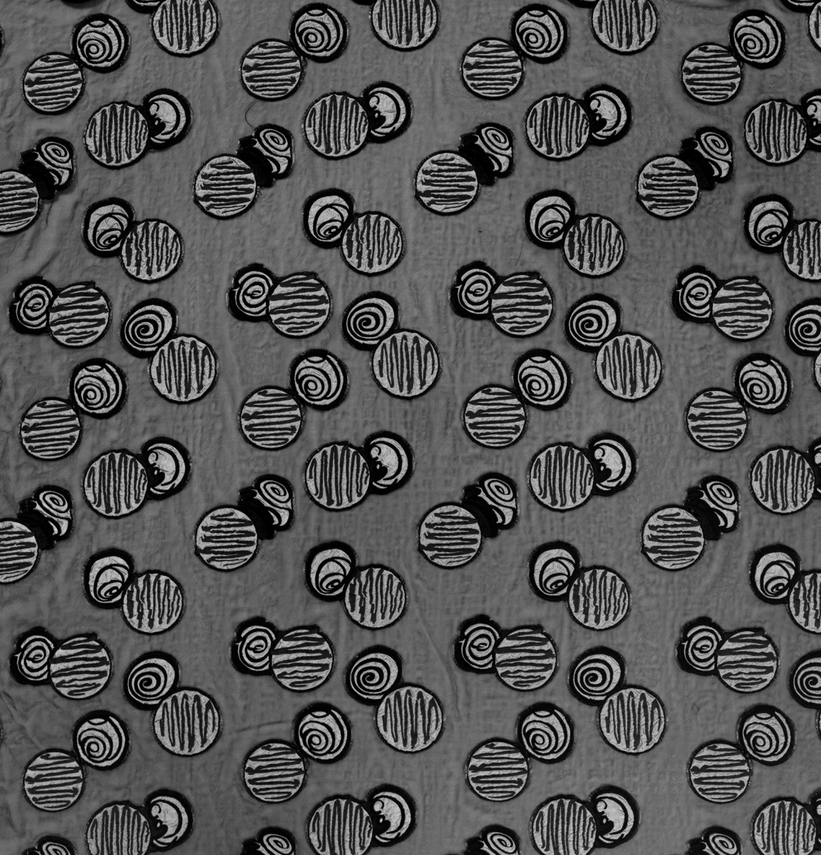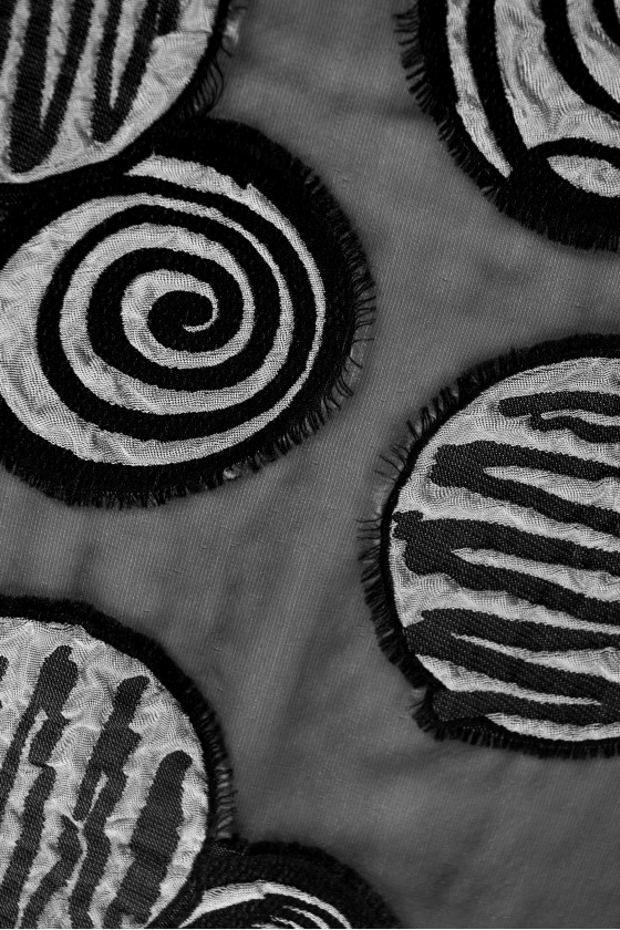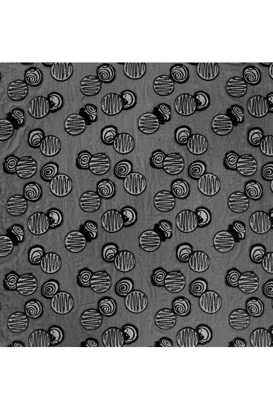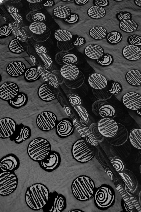 Italiensk polyesterorganza stof i sort med et jacquardmotiv af grå og sorte cirkler (10 cm). Organza er et tyndt, gennemsigtigt, men stift stof med en karakteristisk, delikat glans.
