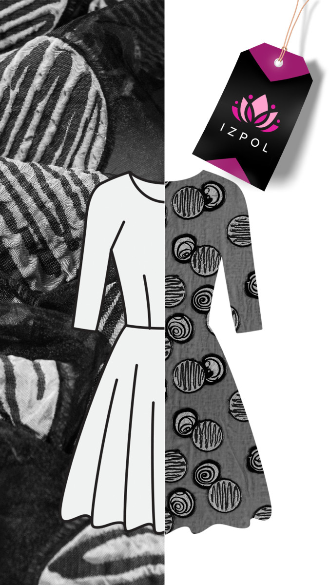 Italiensk polyesterorganza stof i sort med et jacquardmotiv af grå og sorte cirkler (10 cm). Organza er et tyndt, gennemsigtigt, men stift stof med en karakteristisk, delikat glans. Perfekt til syning af en kjole, bluse, skjorte, nederdel.