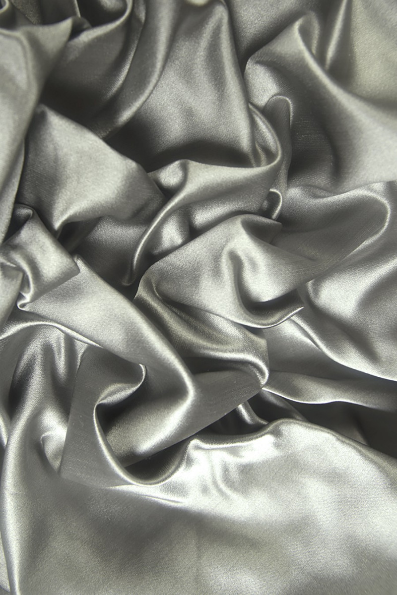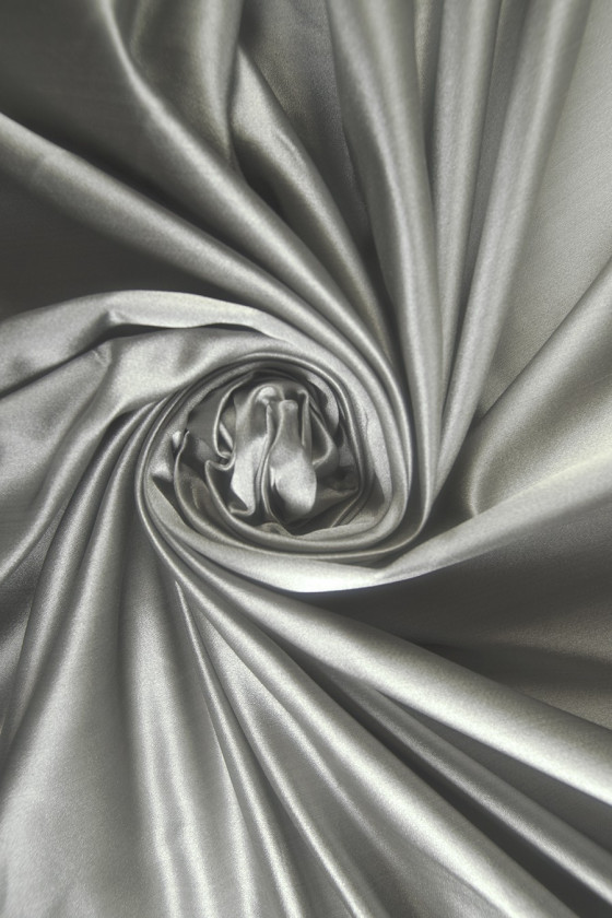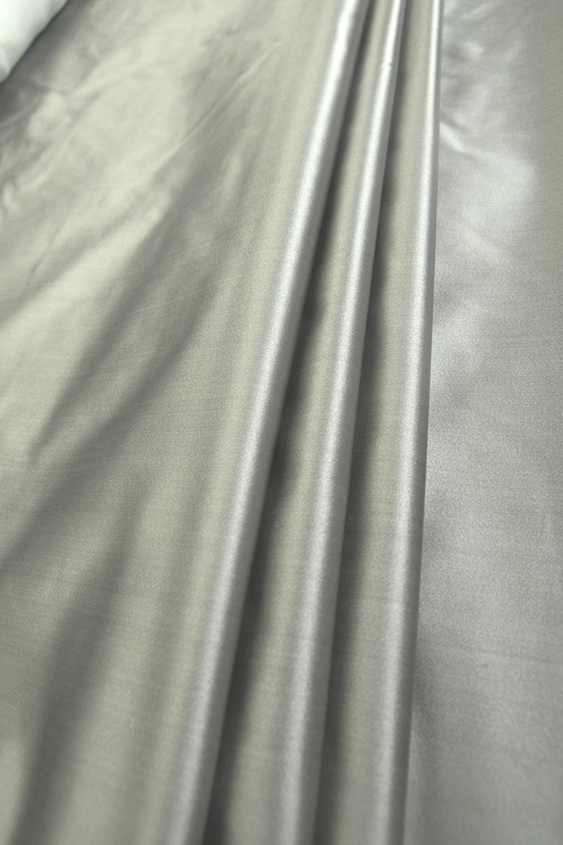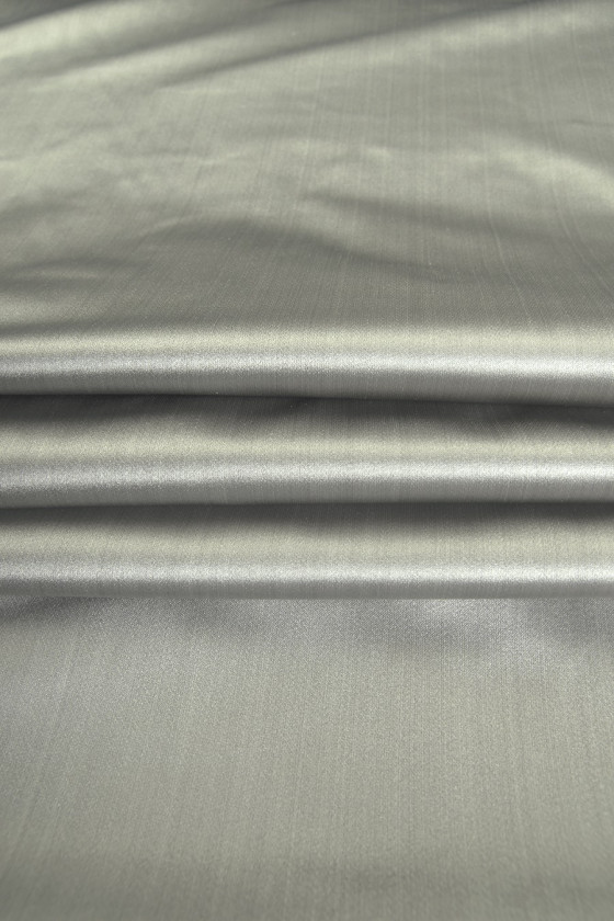 Satin taft dobbeltsidet i grå med en grøn nuance, vævet af to tråde af grå og lys oliven, det er et glat, skinnende og let stift stof. Perfekt til elegante formelle outfits - kjoler, nederdele og tynde frakker. Det kan også være en base for blonder. Det er også velegnet som stof til indretning - til gardiner, puder osv.