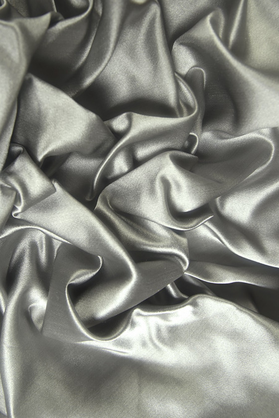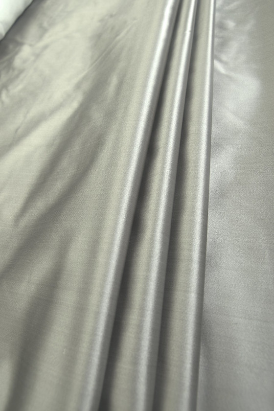 Dobbeltsidet satin taft er et glat stof, blankt på den ene side (grågrøn farve), mat på den anden.