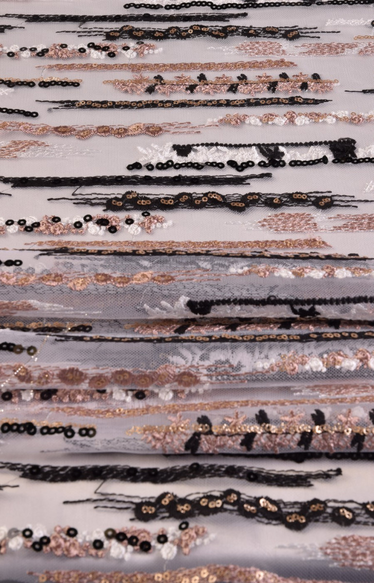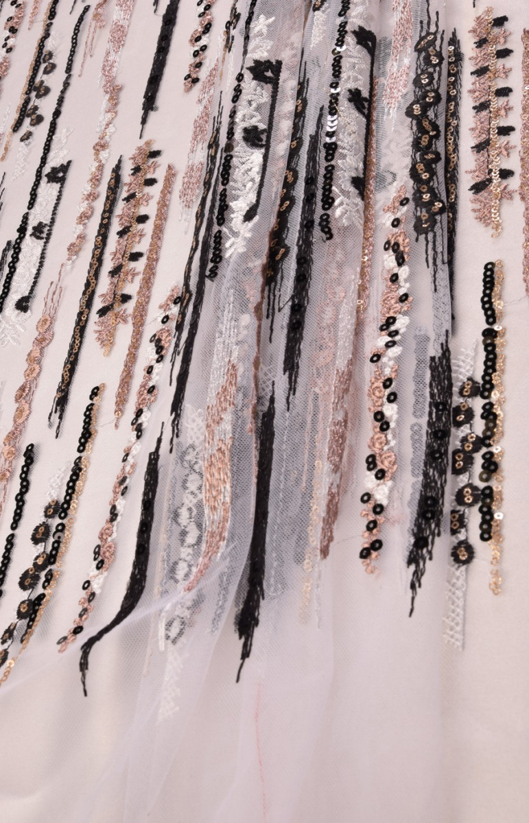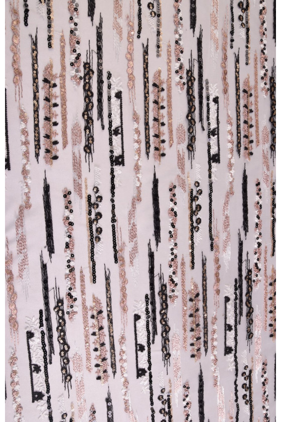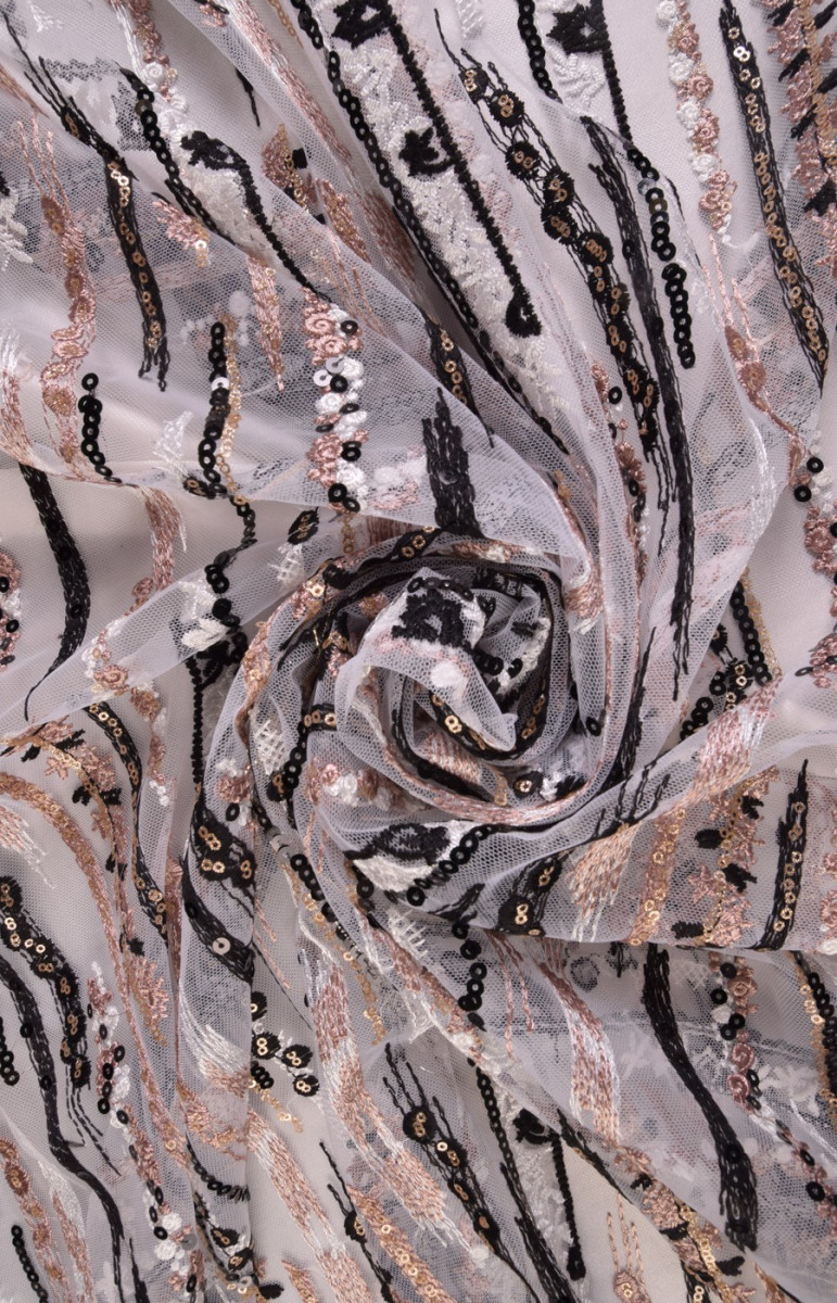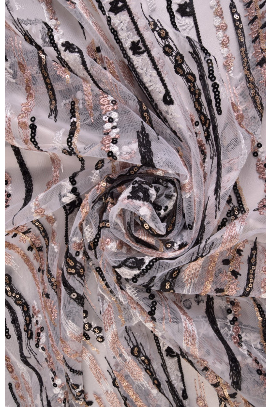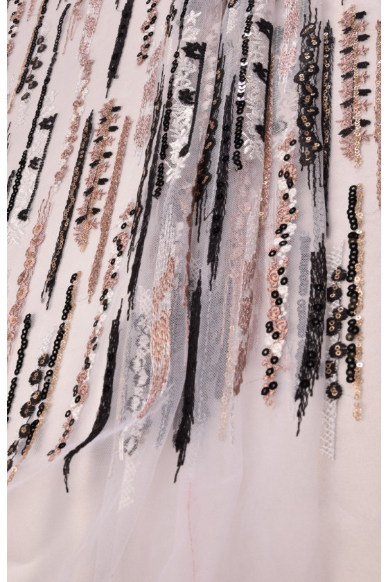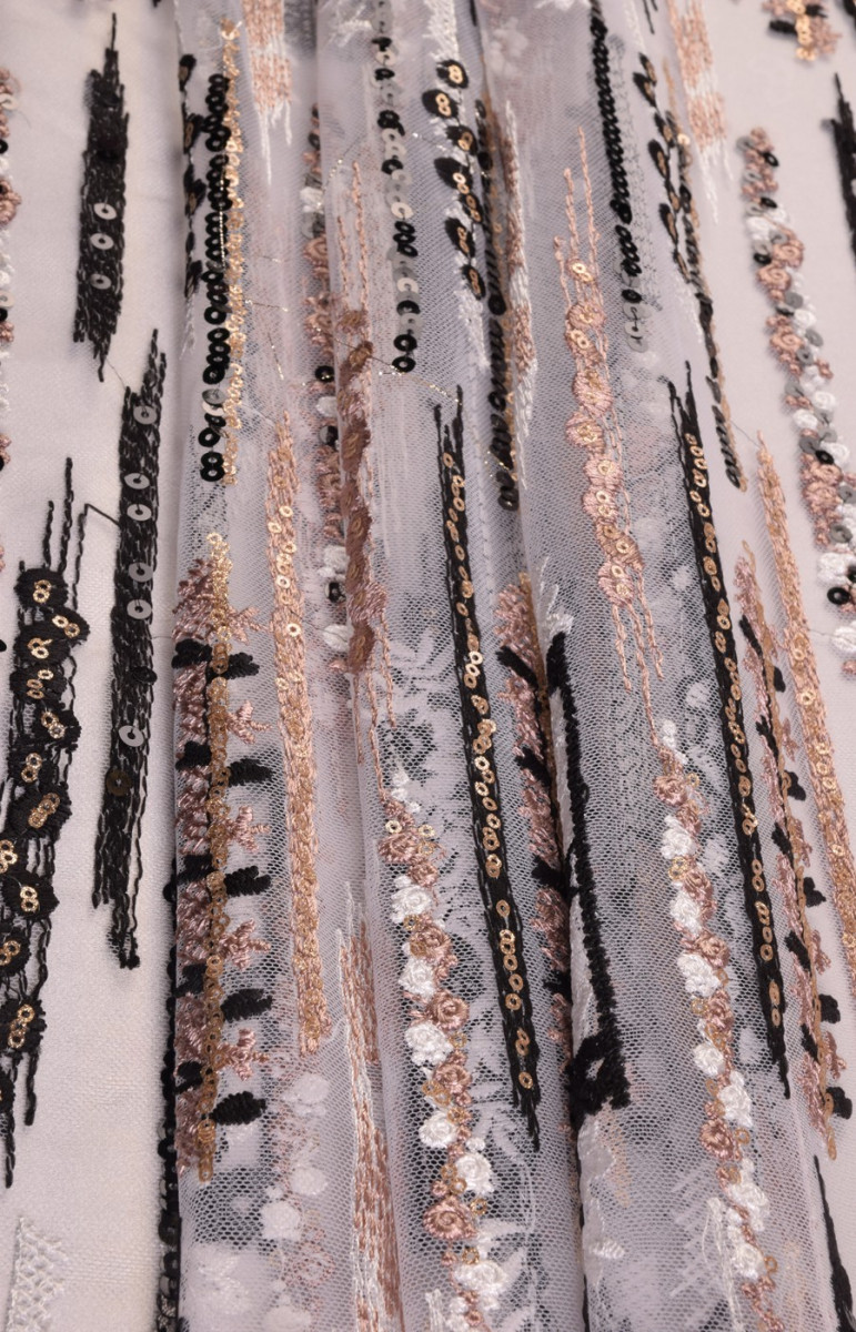Hvid tyl broderet med sort, hvid og laksetråd. Små pailletter sys på broderiet. Tyllen strækker sig i en retning. Et meget imponerende stof, det kan bruges til at sy originale formelle outfits.