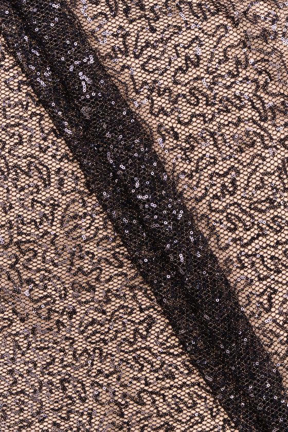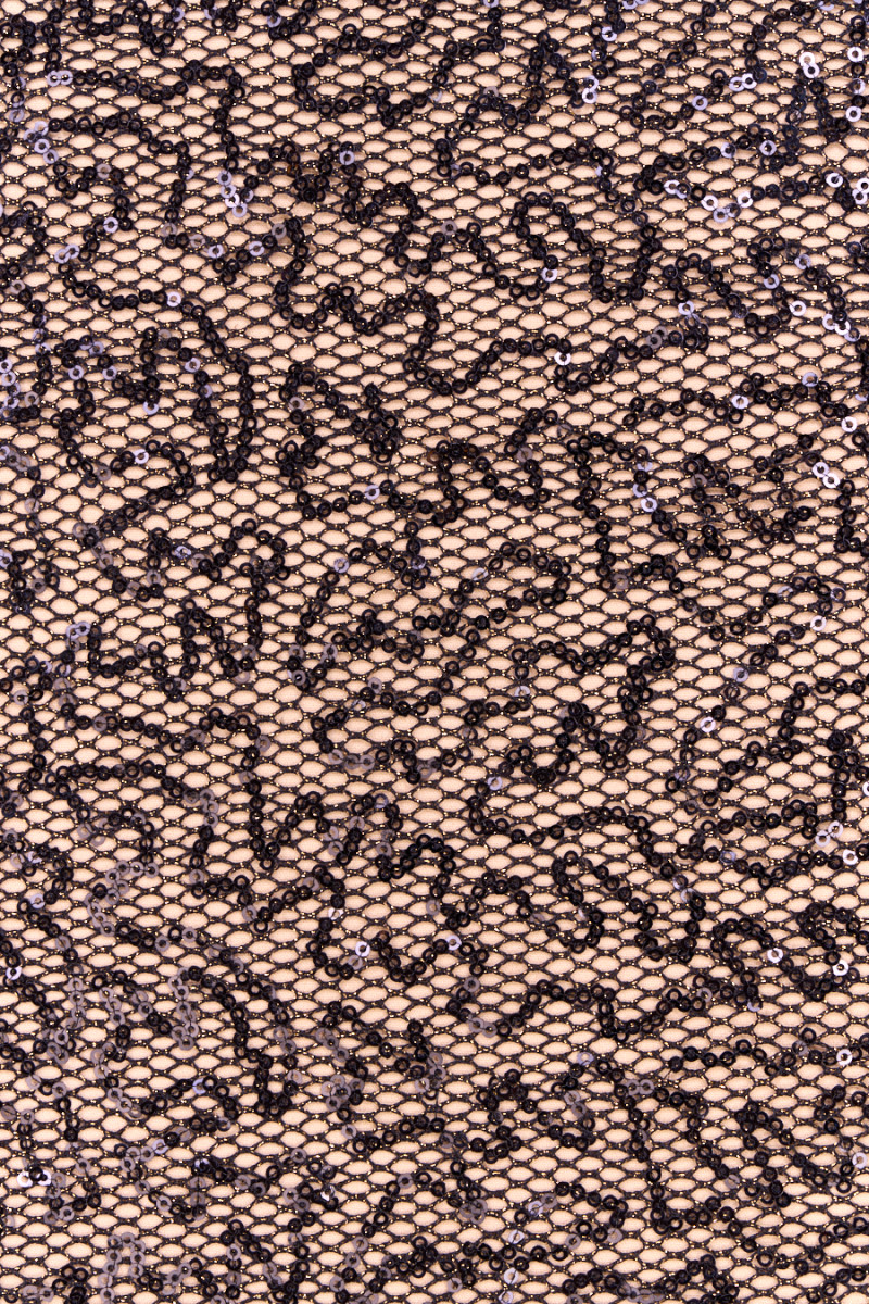 Italiensk mesh stof i sort dekoreret med små, sorte, uregelmæssigt placerede pailletter og gylden, skinnende tråd. Stoffet er let, blødt, gennemsigtigt og let elastisk - det fungerer på tråde. Et meget imponerende forslag, der er perfekt til kjoler, nederdele, bluser.