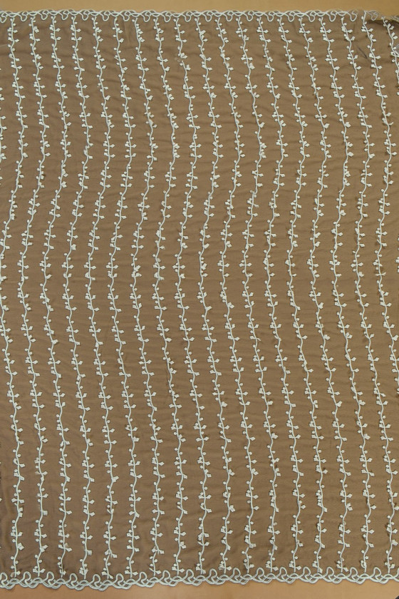 Italiensk aftenstof - chiffon i mørk oliven (tofarvet sort/oliven) med smukt guipurebroderi i ecru farve. Et interessant motiv af kviste arrangeret i lodrette striber hver 5. cm. Stoffet er færdigt på begge sider med en dekorativ tand.