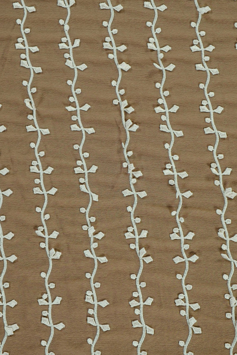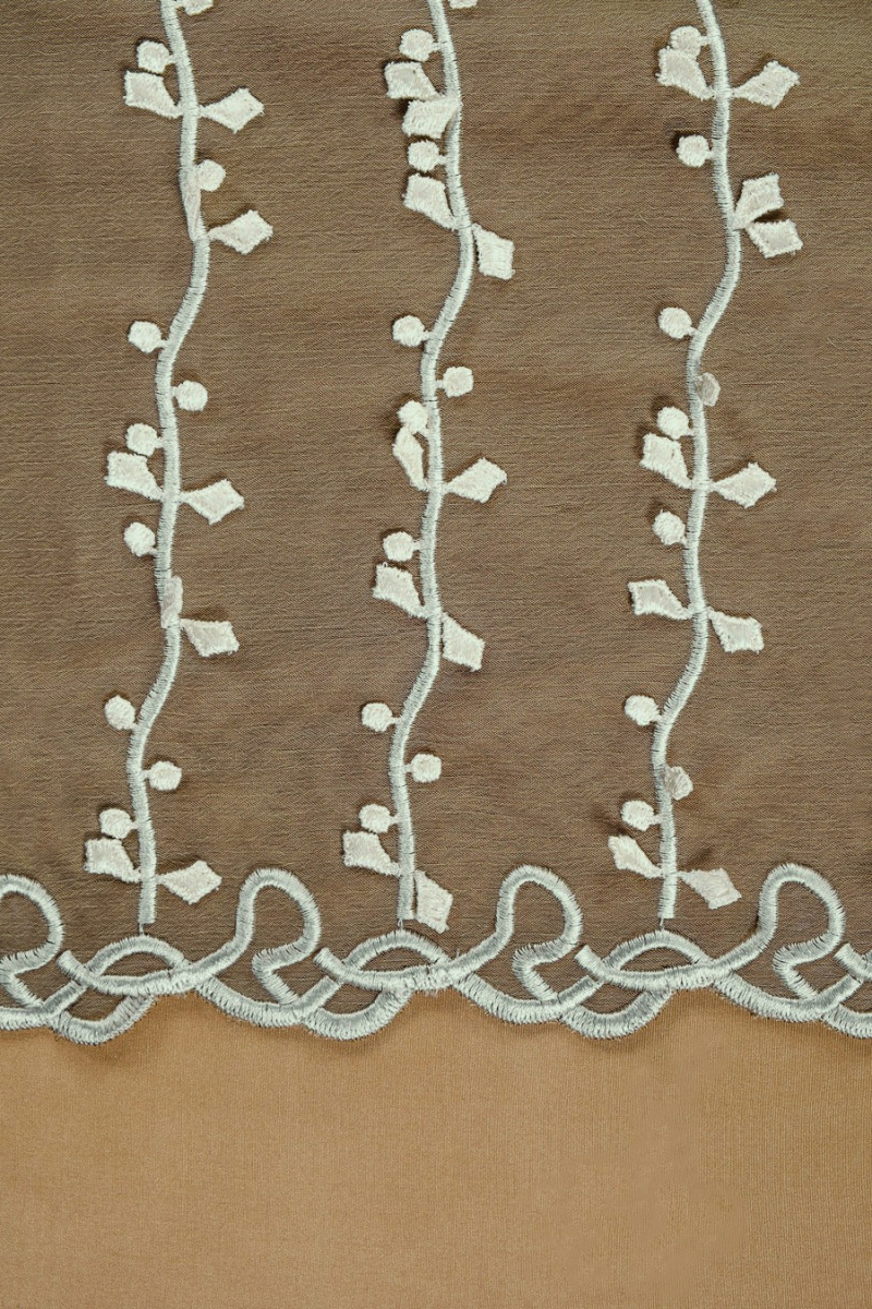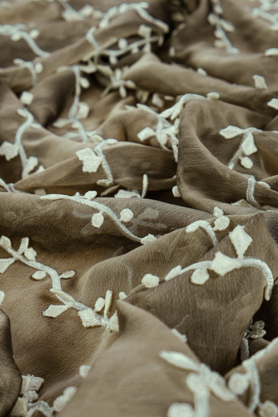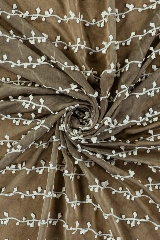 Italiensk aftenstof - chiffon i mørk oliven (tofarvet sort/oliven) med smukt guipurebroderi i ecru farve. Et interessant motiv af kviste arrangeret i lodrette striber hver 5. cm. Stoffet er færdigt på begge sider med en dekorativ tand. Tyndt, gennemsigtigt stof (kræver foring), let - perfekt til syning af kjole, bluse, nederdel.