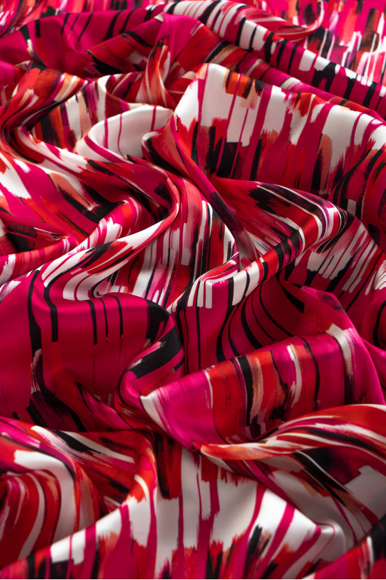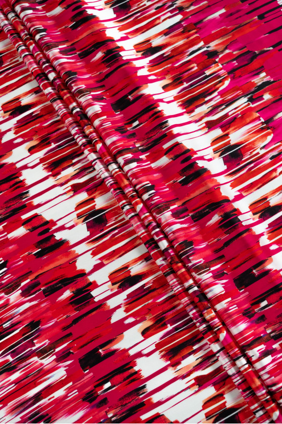 Italiensk polyester twill stof med farverige mønstre i nuancer af pink, rød, sort og hvid. Twill er et stof med en twillvævning, blød, meget holdbar, forsigtigt stiv for at passe. Perfekt til syning af skjorte, kjole, nederdel eller sjal/tørklæde.